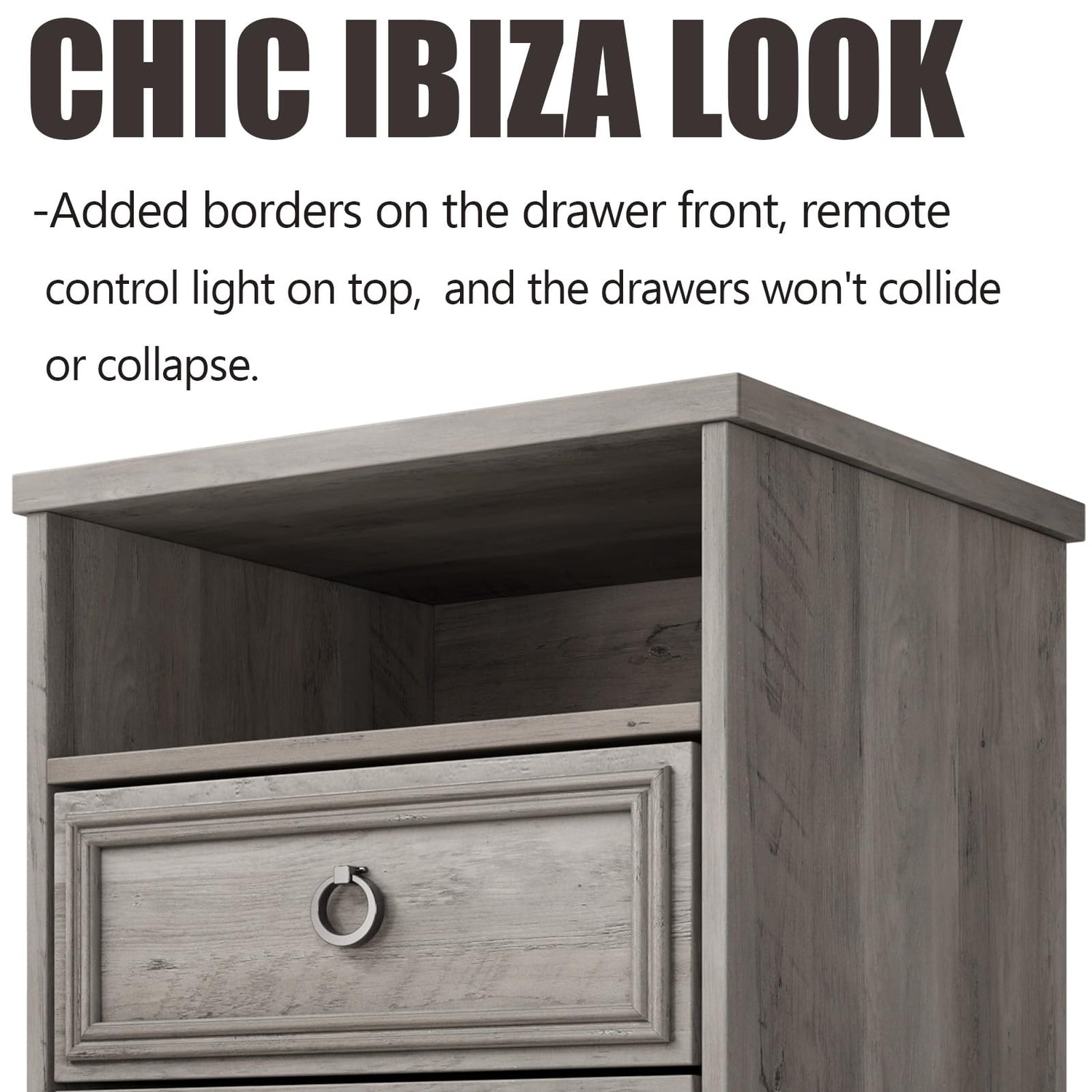 - 【Chic lbiza style】To enhance the smart nightstand further add a remote LED strip light, to help shed subtle light on the contents. This chest cabinet is elegant in workmanship, added borders on the drawer front, combined with the classic wood grain, adds a modern feel with a suitably vintage flavor.