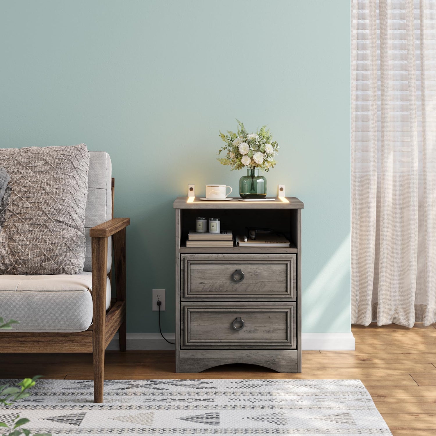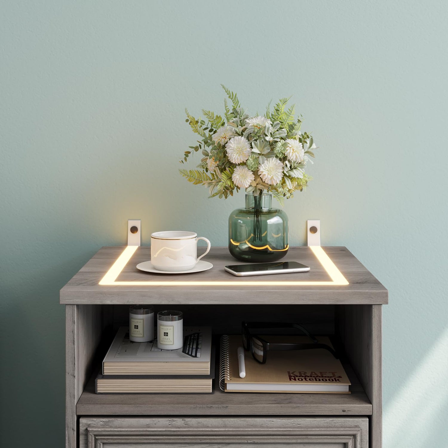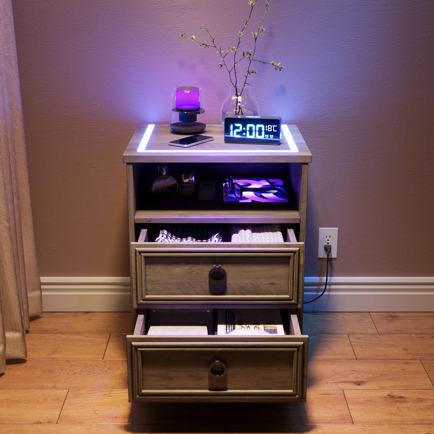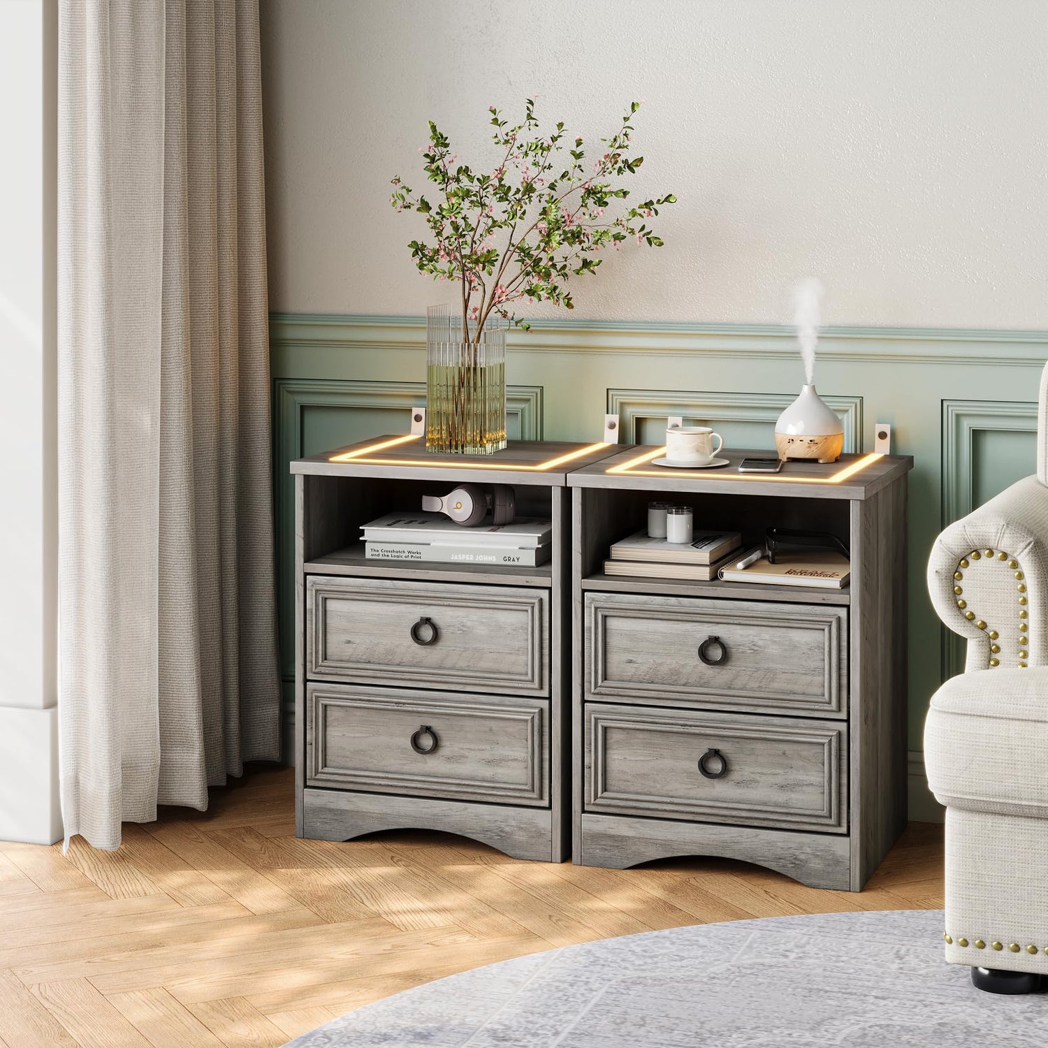 Nightstand with Strip Lights Set of 2, Night Stand with Drawers, Accent Bed Side Table and End Table with Open Storage for Bedroom, Living Room,Gray