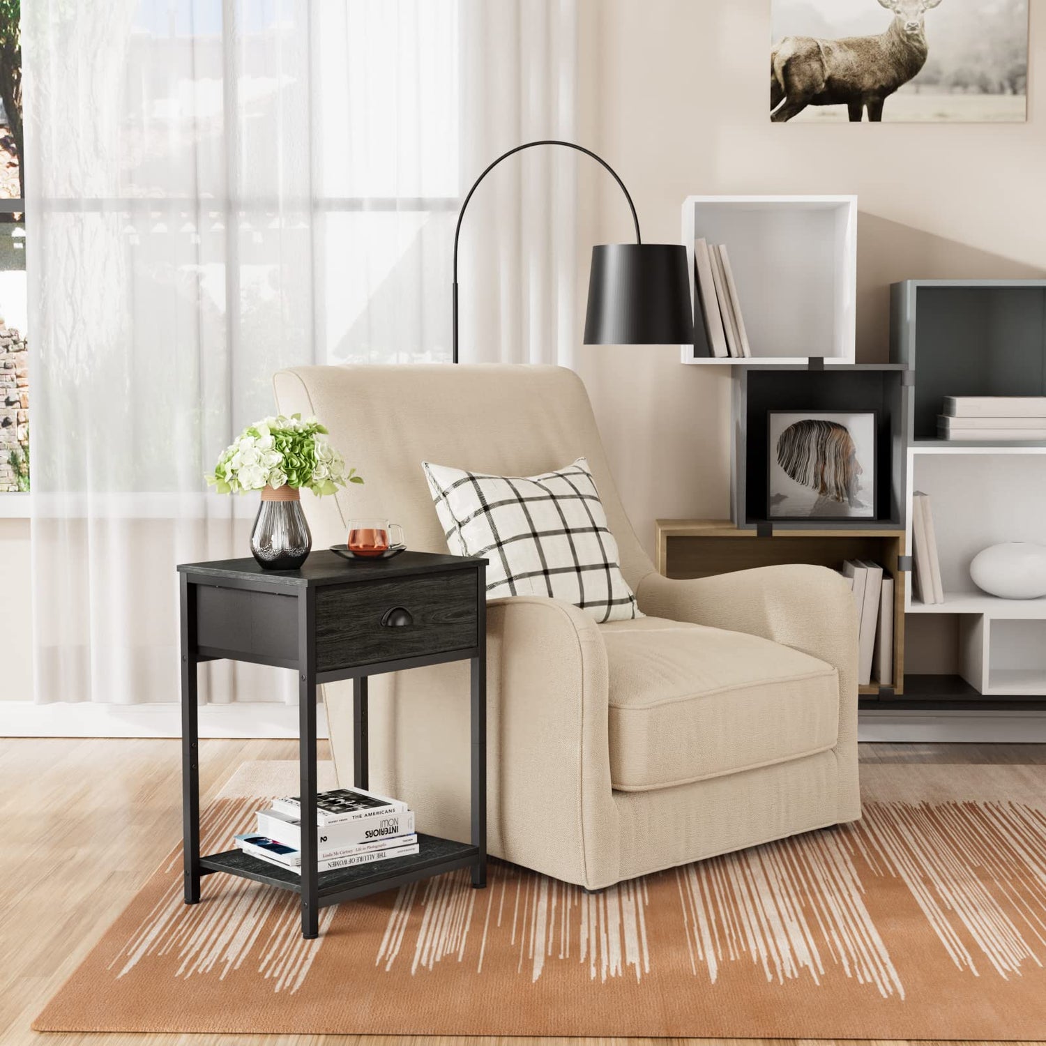- 3-Tier Storage Option: This tall side table includes 2 tiers of open shelves provide ample space for storage and display. The open top shelf is perfect for displaying picture frames and plants. A drawer with handles provides more space to store personal items you want to put in.