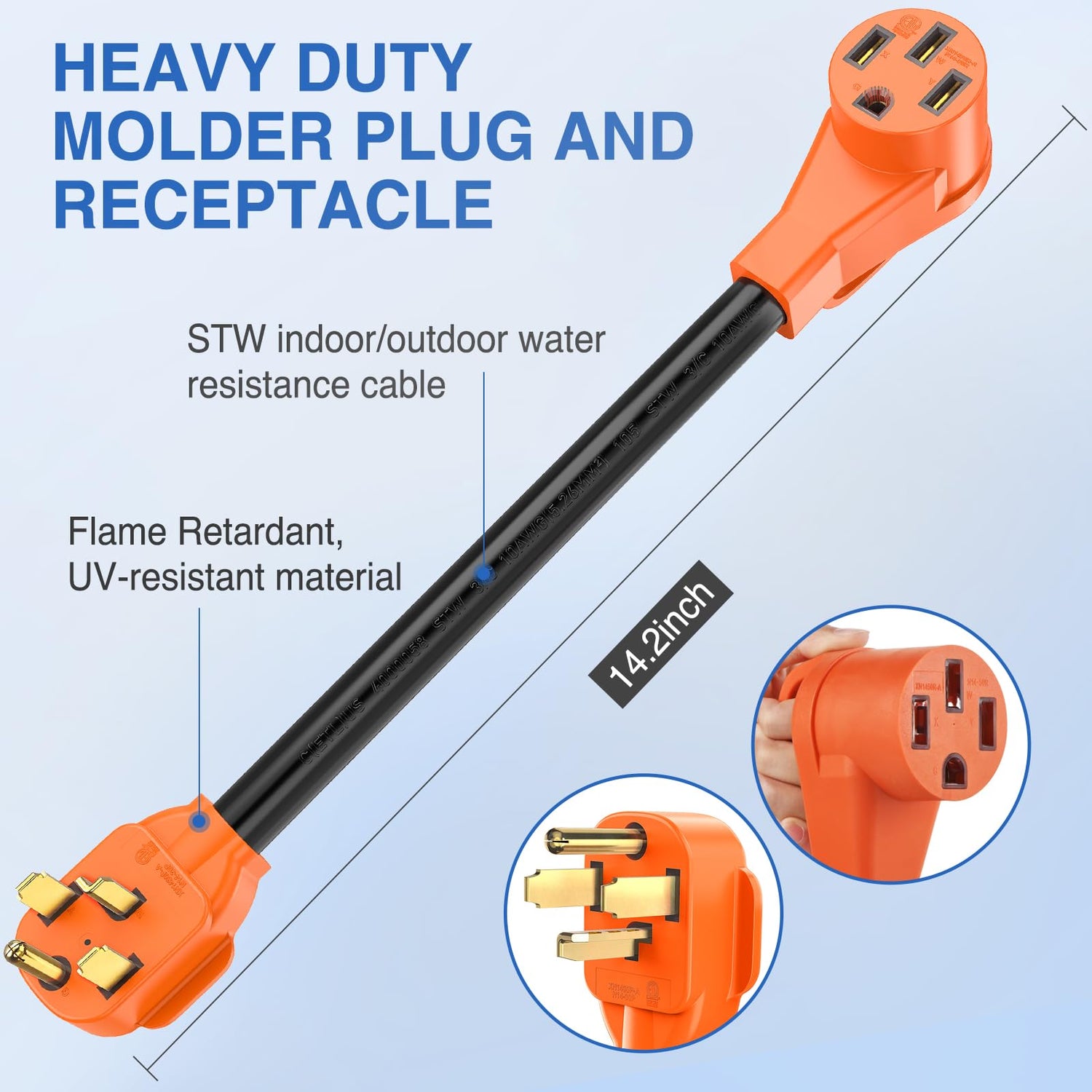 - Electrical Rating: 30 Amp (NEMA 14-30P) male to 50 Amp (NEMA 14-50R) female heavy-duty power adapter. Rated for 125V/250V and 3750W . Length 12 Inch. Constructed with 4 of 10 AWG wires to ensure high electrical conductivity. Tips: Adjust your charging rate (preferably not more than 30 AMP) to prevent prolonged charging from causing the plug to heat up or triggering the circuit breaker.