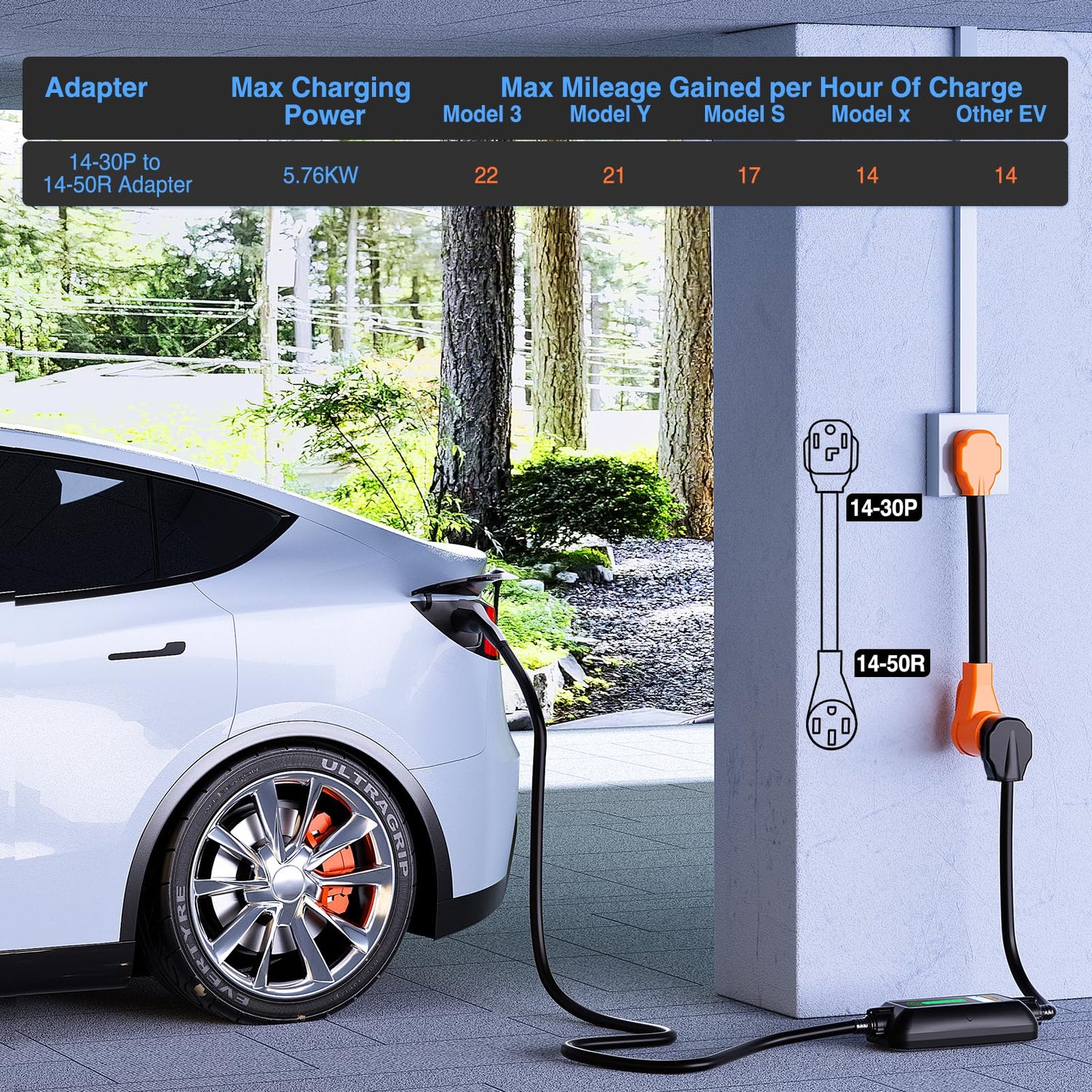 - 30A to 50A Adapter: Allows you to charge Your EV in the garage or home with 4 4-prong dryer outlets. The NEMA 14-30P 4-prong plug is compatible with the new dryer outlet. Note: suitable for Level 2 J1772 EV electric vehicle charging. It's not fit for an RV or dryer. Please check if the receptacle of your home outlet is NEMA 14-30R.