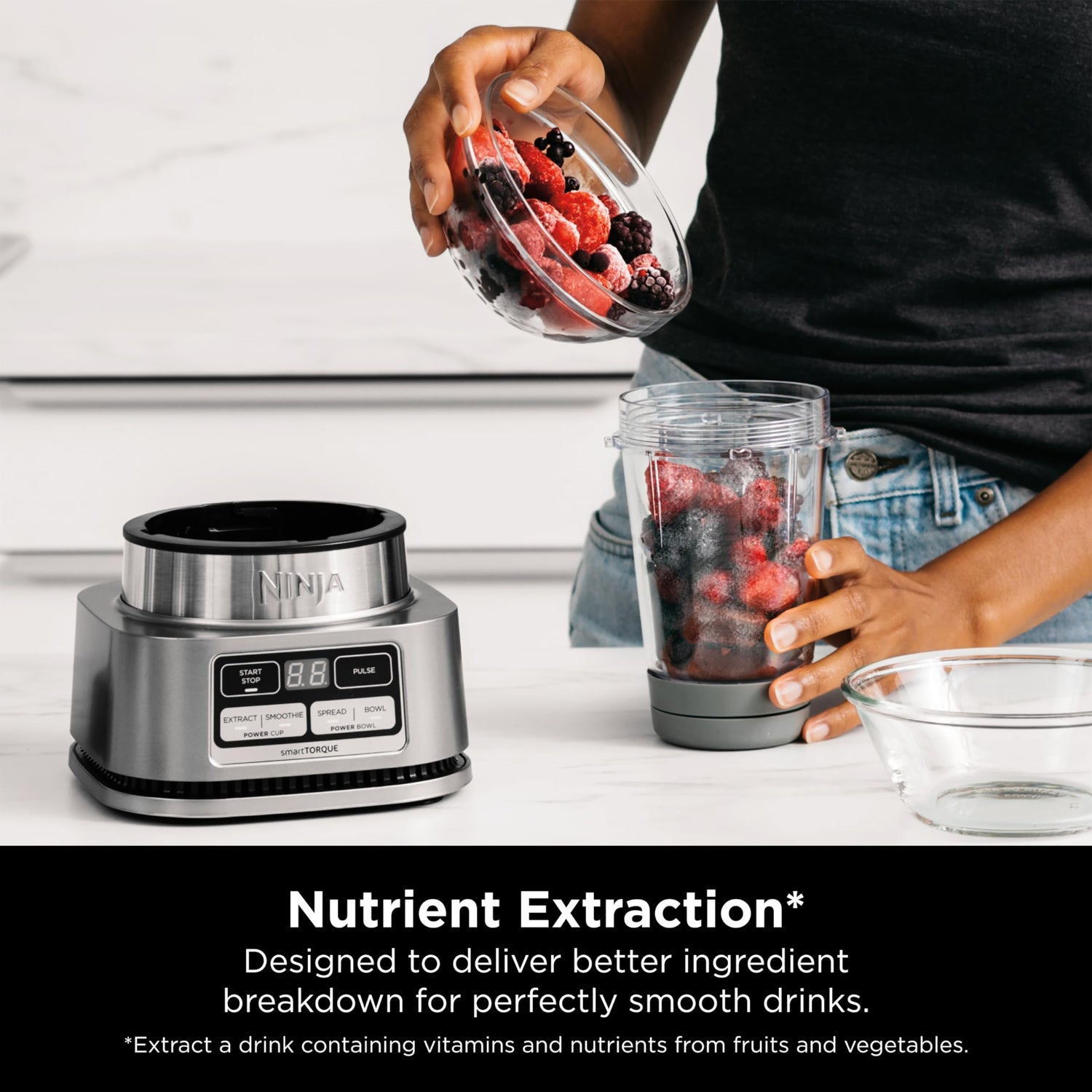 Details: Ninja Foodi Smoothie Bowl Maker and Nutrient Extractor* with smartTORQUE is designed to blend and power through the thickest ingredients at high speed and never stall. One base with multi-functions. The Ninja Nutrient Extraction* Cup and Spout Lid for smoothies and extractions. The Smoothie Bowl Maker with built-in tamper powers through frozen foods with less liquid for thick smoothie bowls and nut butters. 1200-peak-watt power-dense motor.
