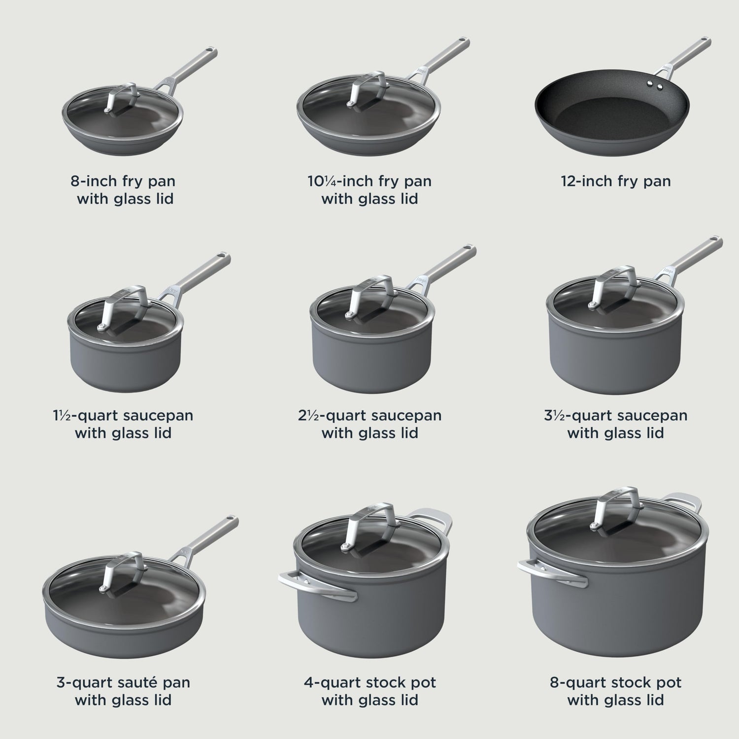 - WHAT’S INCLUDED: 8'' Fry Pan with Glass Lid, 10.25'' Fry Pan with Lid, 12'' Fry Pan, 1.5 qt. Saucepan with Lid, 2.5 qt. Saucepan with Lid, 3.5 qt. Saucepan with Lid, 3 qt. Sauté Pan with Lid, 4 qt. Stock Pot with Lid & 8 qt. Stock Pot with Lid.