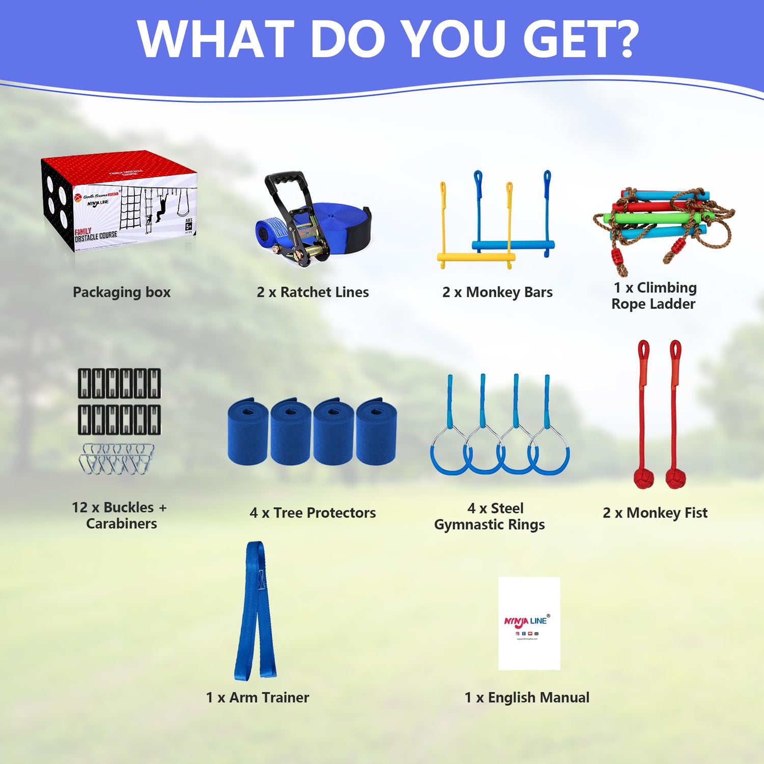 - FUN NINJA OBSTACLE COURSE: Our ninja training course are specially designed for kids over 5 years old. Upper Line can be installed 10 obstacles, and Ground Line can be used as a training line to improve strength and balance. Get your kids OUTSIDE and Overcome obstacles course of different difficulty in the most fun ways. Warriors never afraid of difficulties