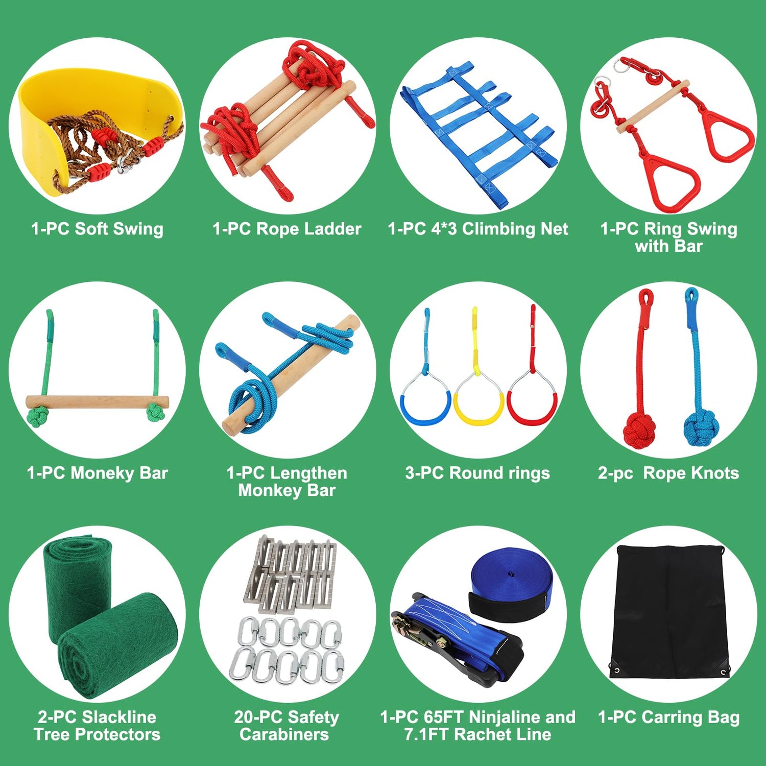 Ninja Warrior Kids Obstacle Course, 65 FT Durable Slackline with 7 Obstacles-Swings, Monkey Bars, Arm Trainers and More, Weatherproof Outdoor Obstacle Course for Backyard, Gym, Field