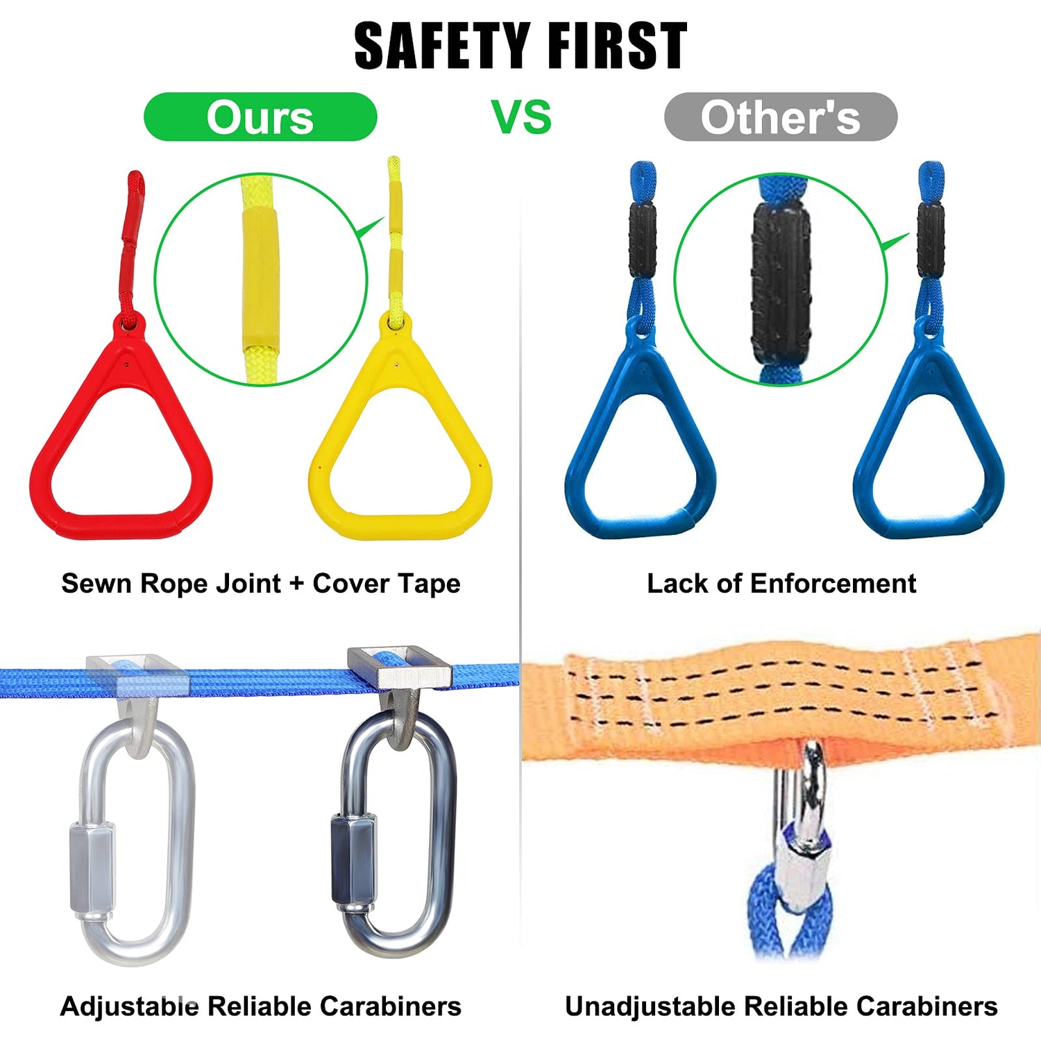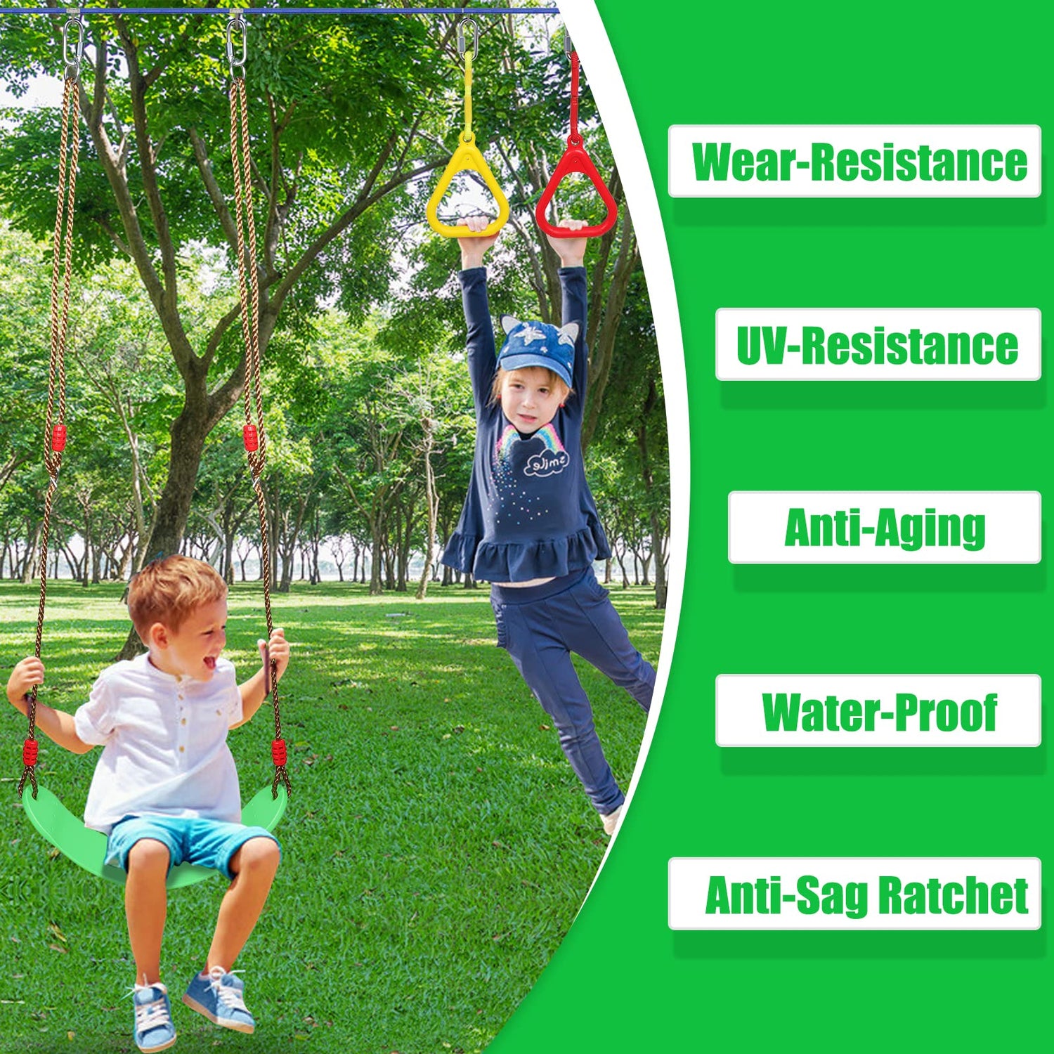 - 【High Security】:The heavy-duty ratchet grips the rope tightly to ensure kids don't wobble while playing, and the reinforced climbing buckles and clasps prevent breakage and corrosion, providing the highest level of safety. With a maximum weight of 440 pounds, the rope is suitable not only for children over 5 years old, but also for adults in that weight range.