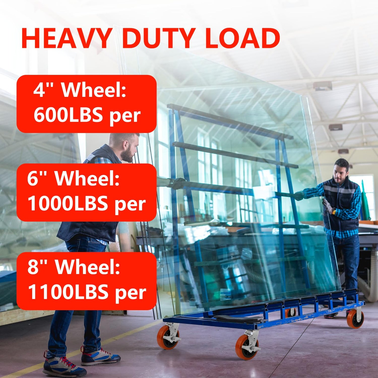 - Heavy Duty Load: 4" wheel: 600 lbs. ;6" wheel: 1000 lbs.; 8" wheel: 1100 lbs.; Non-Marking floor safe wheel.