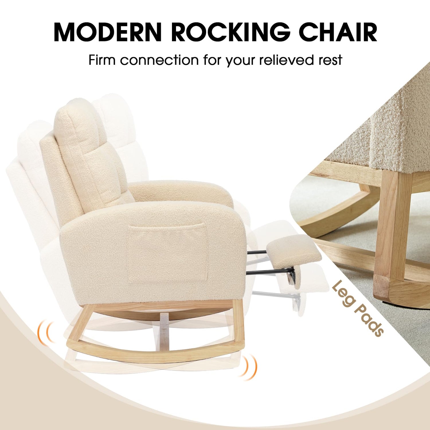 NIOIIKIT Modern Nursery Rocking Chair, Teddy Upholstered Rocking Chair with Footrest, Comfortable Rocker Recliner with Side Pocket, Rocker Glider for Living Room, Bedroom, Nursing Room (Apricot)