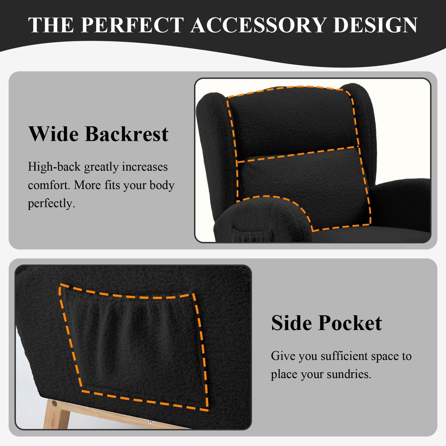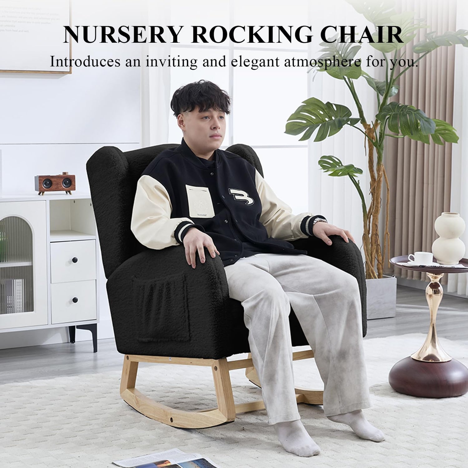 NIOIIKIT Nursery Rocking Chair with Footrest, Teddy Upholstered Glider Chair, Nursery Gliding Recliner with Side Pocket, Glider Rocker for Living Room (Black Teddy)