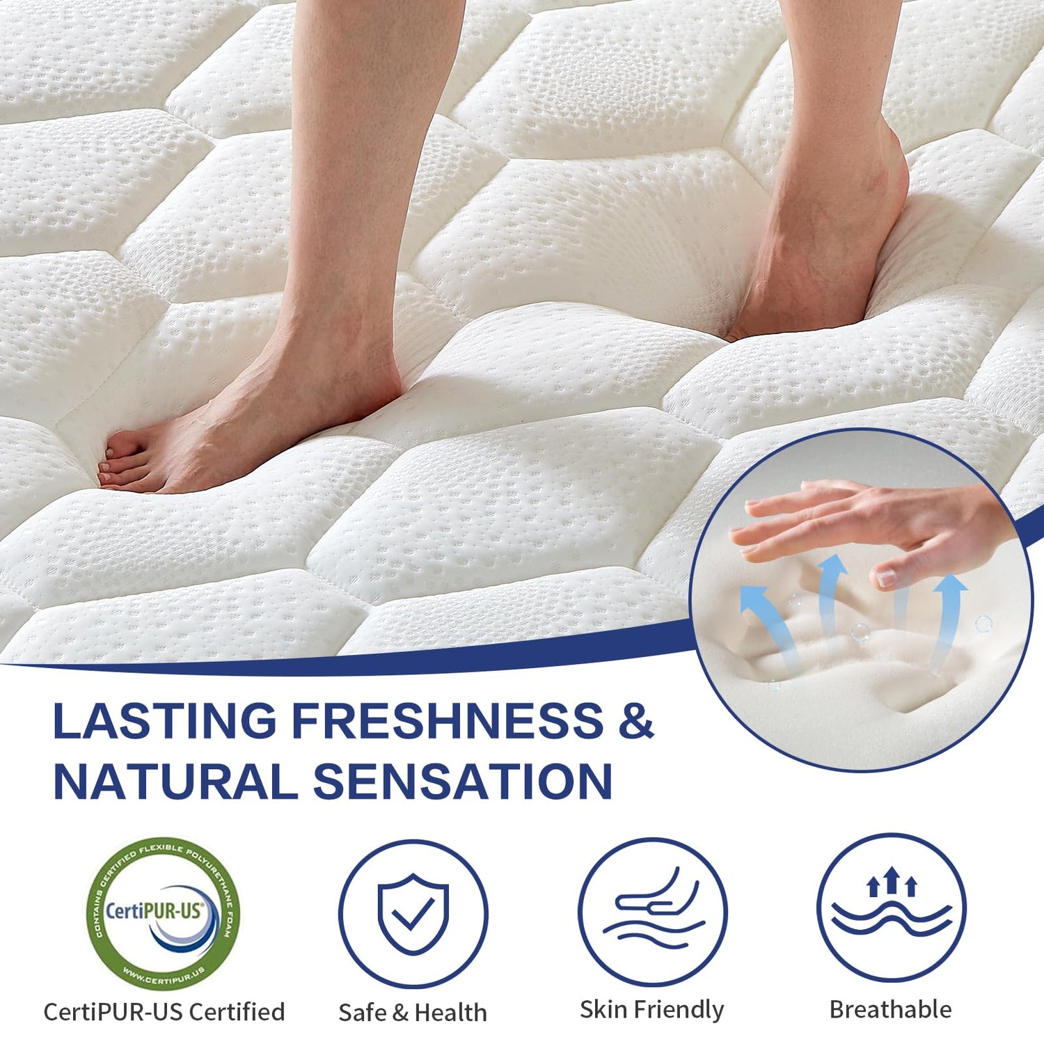 - 【Material and Structure】Our queen mattress is made CertiPUR-US Certified foam, and does not contain glass fiber or toxic chemicals. It consists of breathable knitted fabric, memory foam, flame retardant cotton layer, independent bagged spring, high-density sponge, etc. Queen mattresses can achieve safer and healthier sleep, providing you with a high-quality sleeping environment.