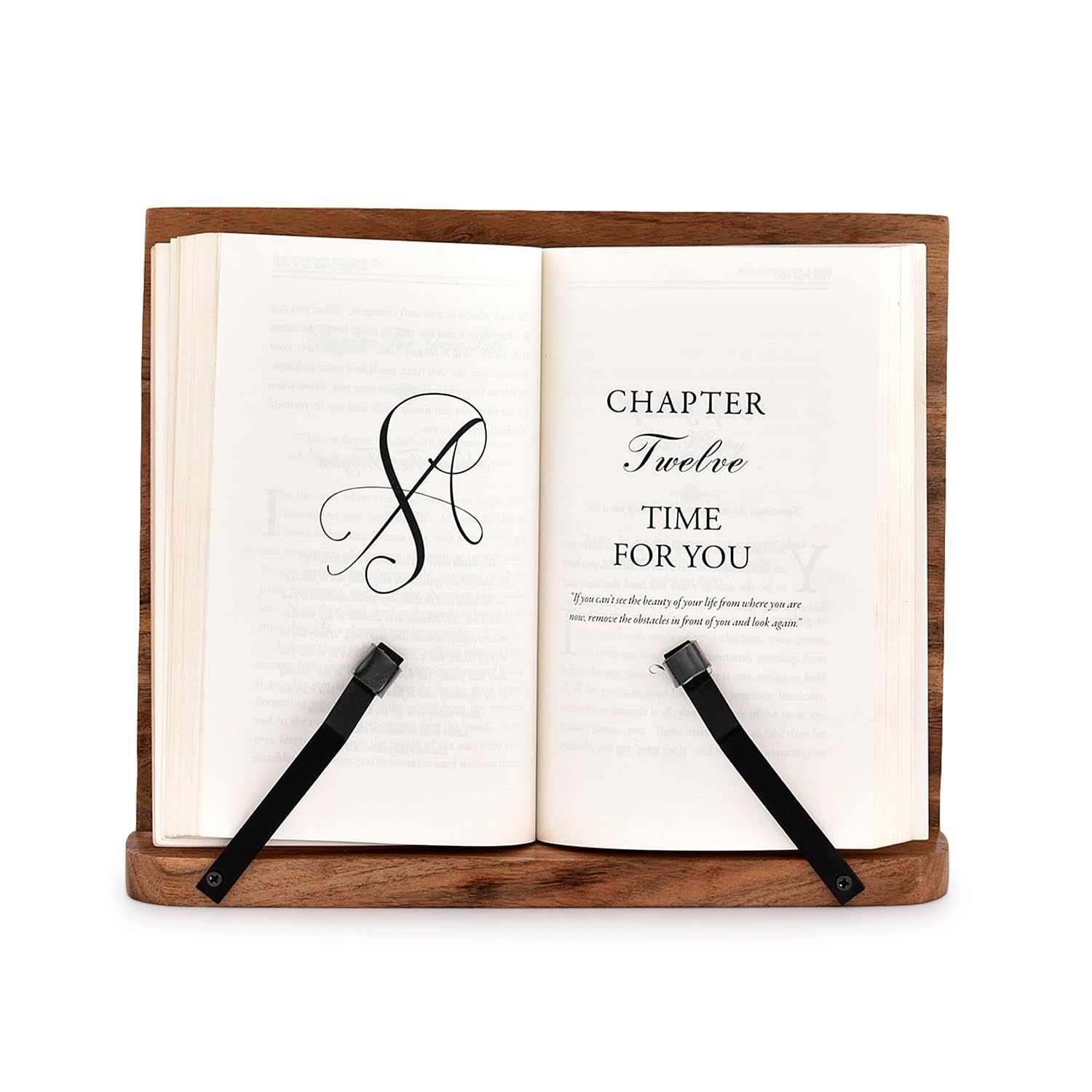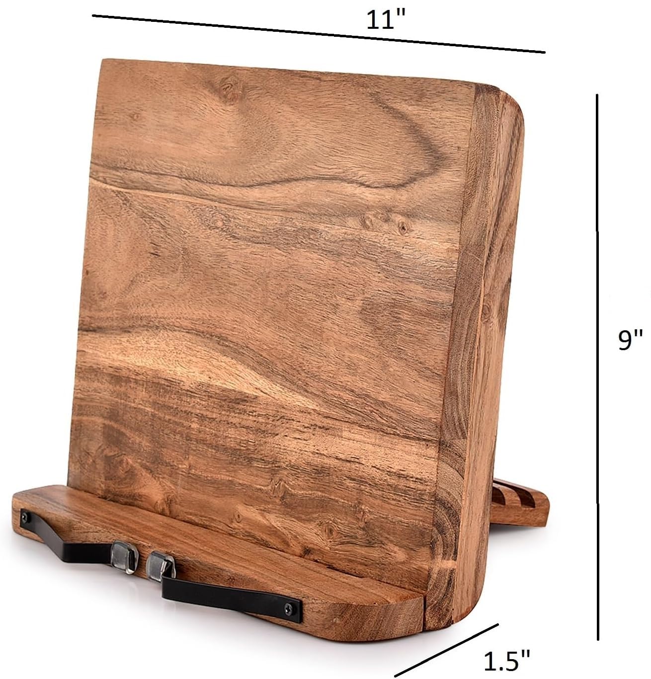 - The Book Stand is compact and made of durable high-quality Acacia Wood and the sturdy and wide front tray design is not only suitable for displaying recipe files and sheet music but also ideal for supporting books of various sizes,