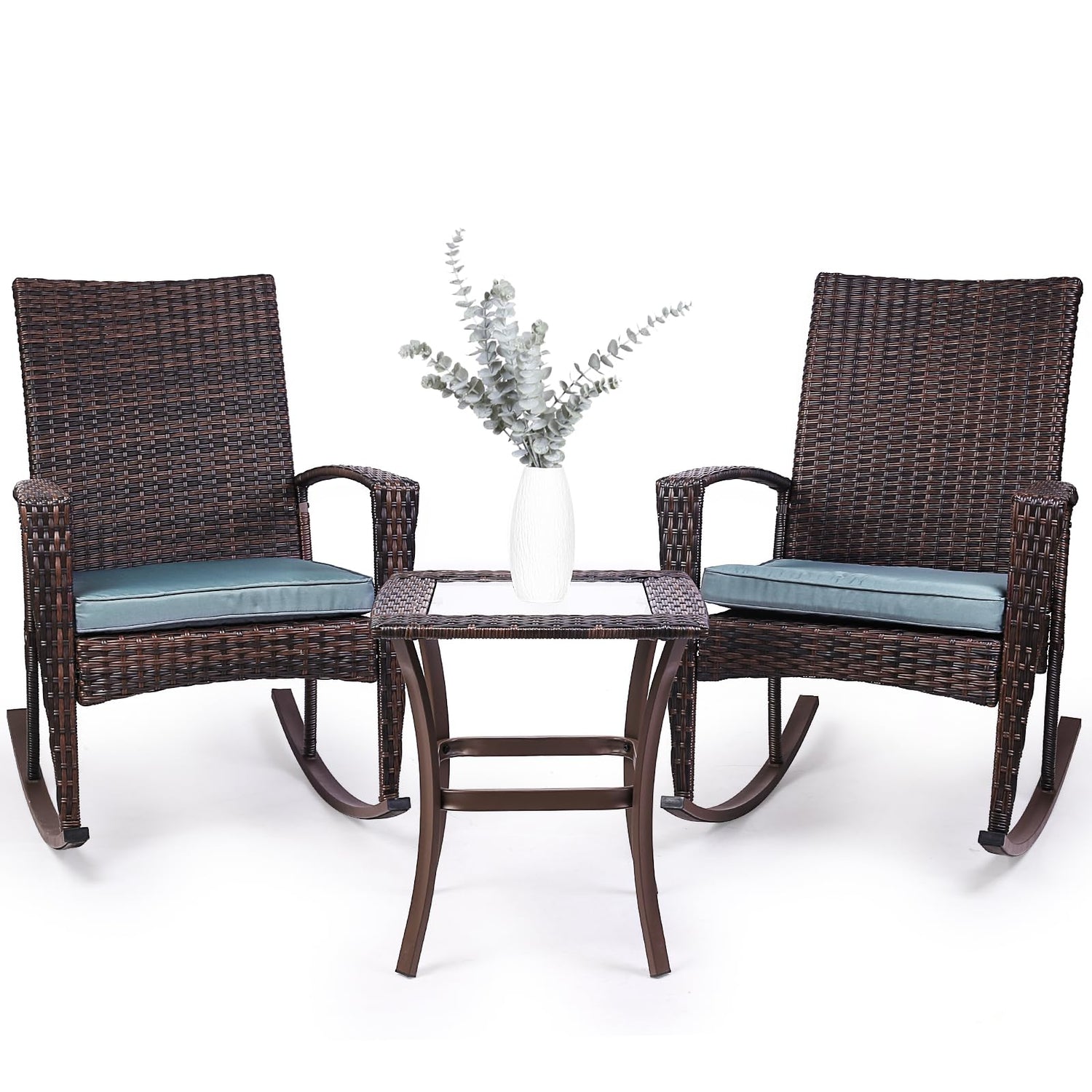 Details: This 3 Pieces Patio PE Rattan Wicker Furniture Sets, including 2 rocking chairs, 1 coffee table and 2 cushions. The Metal Patio Conversation Sets are specially designed to make a better use of the porch, outdoor patio, garden and backyard space.