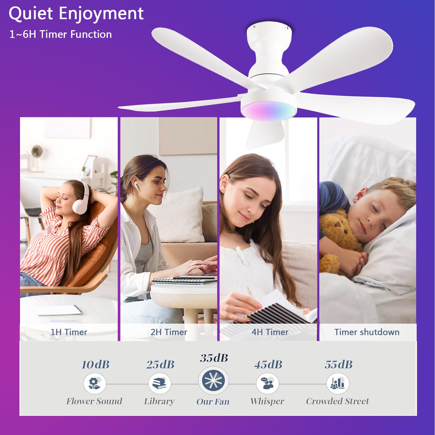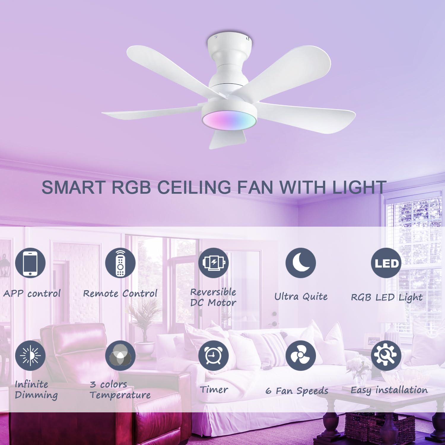 - 【Dimmable rgb led ceiling Fan】Press the "on/off light" button to turn on the light {from warm white (3000K) to natural light (4500K) to cool white (6000K)}. The brightness of the low profile ceiling fan can be adjusted within the range of 5% to 100% to meet different lighting needs in different environments.