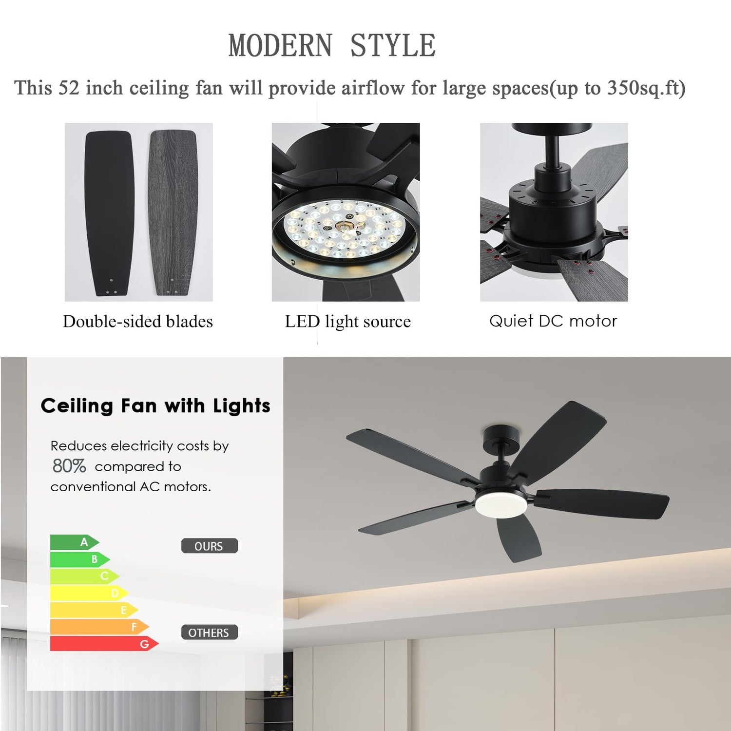 - 【Dimmable Black Ceiling Fan】: This 52 inch ceiling fan has 3CCT dimmable LED lights. LED can adjust brightness(5%-100%), and can change three color temperatures (warm light 3000K/daylight 4000K/cool light 6500K), you can adjust different color temperatures and brightness when you are partying, working or reading. The advantage of LED light sources is that they are more eye-friendly, energy efficient, and have a longer life than ordinary incandescent and fluorescent light sources.