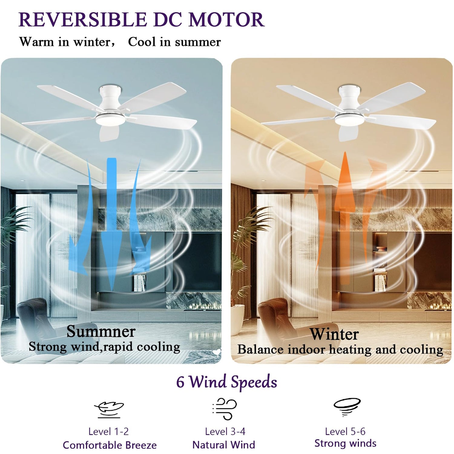- 【Low Profile DC Motor Celing Fan】:The high-quality DC motor provides a comfortable experience throughout the year. Which has a noise below 30DB during operation, and the maximum CFM. Compared with the AC motor, it not only reduces the energy cost, but also is more stable and safe. The low profile ceiling fans unique reversible design can cool down in summer and keep the room warm in winter