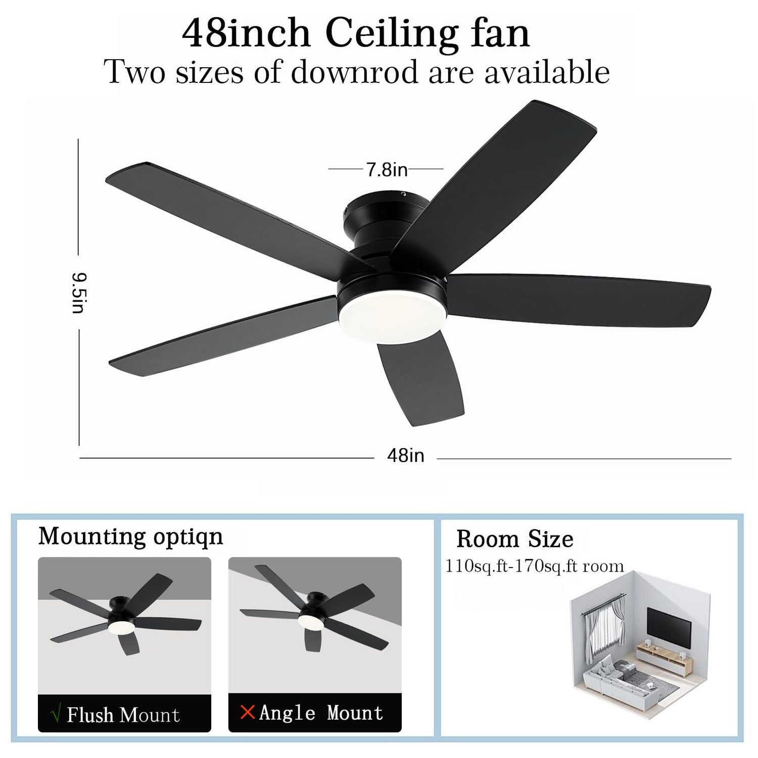 NKPU Black Ceiling Fans with Lights, 48Inch Low Profile Ceiling Fan with Light and Remote/App Control, Flush Mount, Reversible DC Motor, 3CCT Dimmable led, Modern Ceiling Fan for Indoor/Outdoor Use
