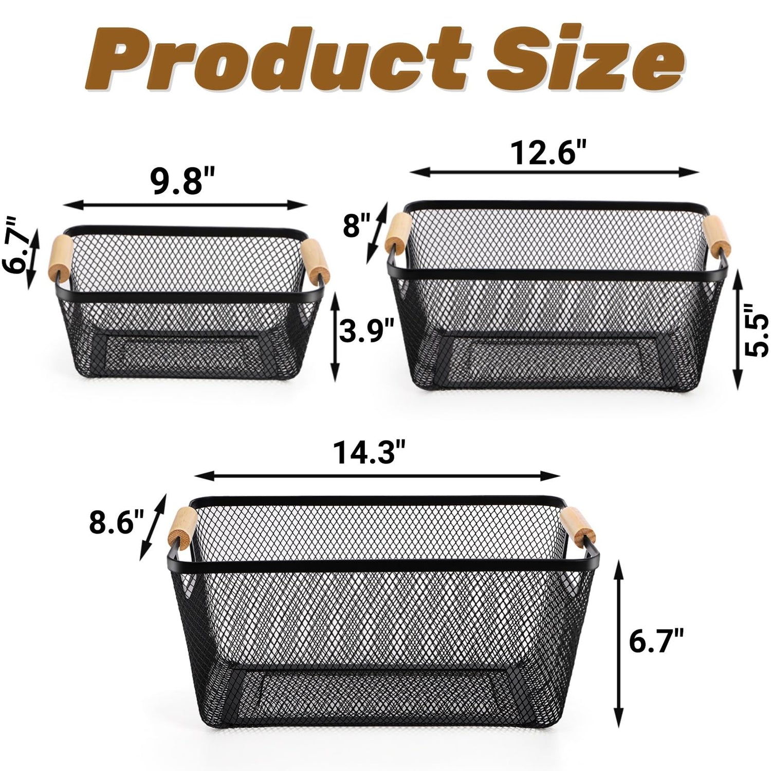 - Valuable Set: You will receive 3 packs of metal mesh baskets with wood handle in this package. Each set consists of small, medium, and large sized baskets, measuring 9.8"x6.7"x3.9", 12.6"x8"x5.5", and 14.3"x8.6"x6.7". Different sizes are perfect for meeting various storage needs.