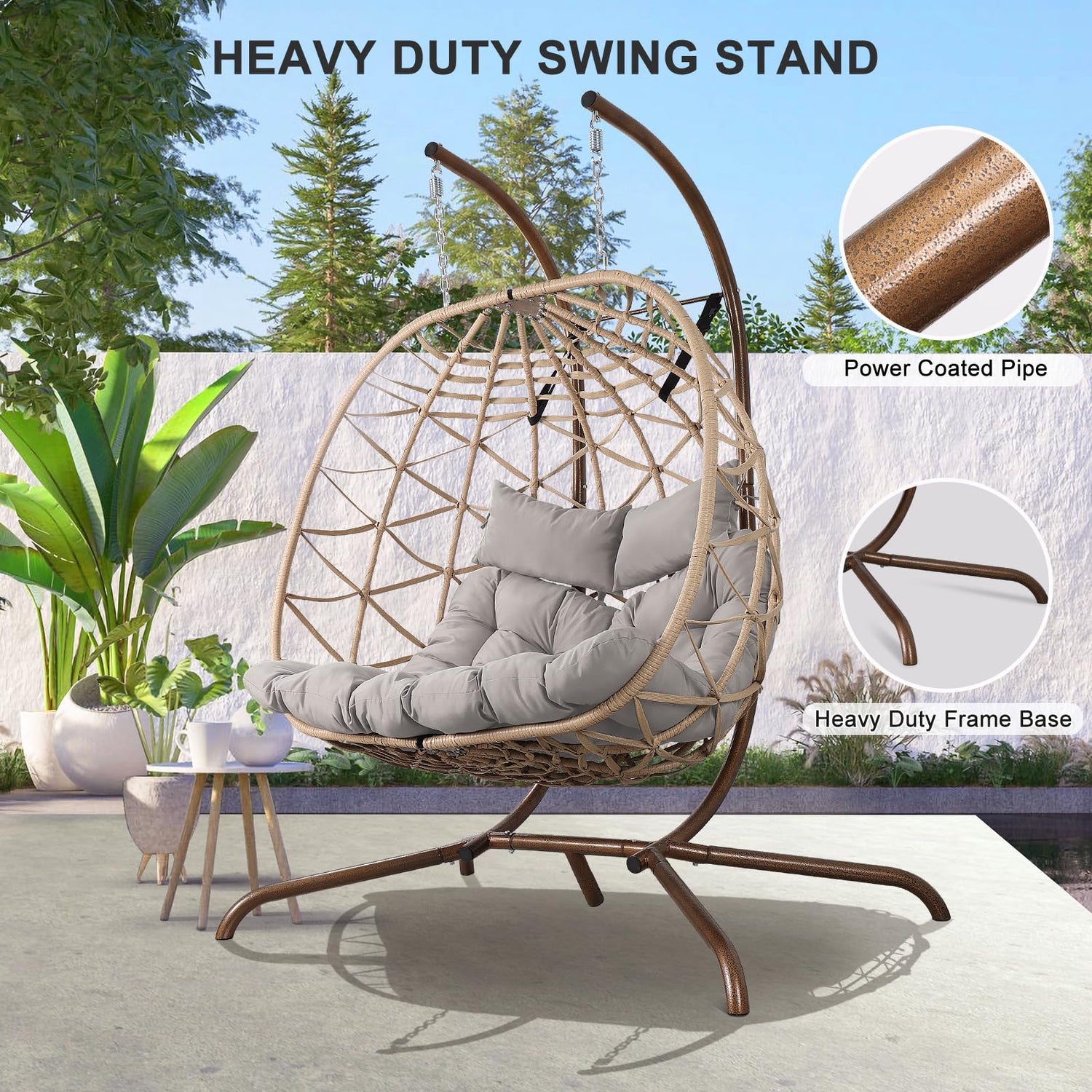 - STURDY STRUCTURE:Its steel frame is wrapped with rattan and treated with powder coating and electroplating, enabling it to withstand outdoor weather conditions. The double hook design ensures safety, while the heavy-duty stand base makes the egg swing chair with stand more stable and prevents it from tipping over