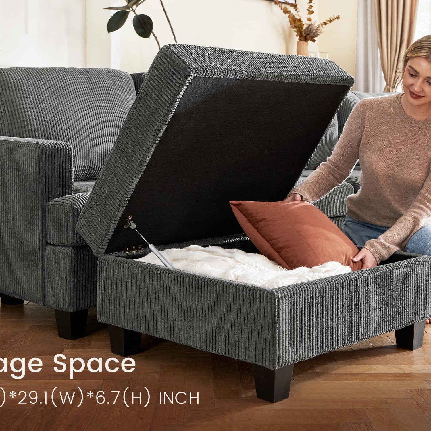 - Sectional couches with storage: This sectional piece includes a large storage ottoman, sized at 29.1" x 24.4" x 6.7", great for storing toys, blankets, books, and keeping the area neat