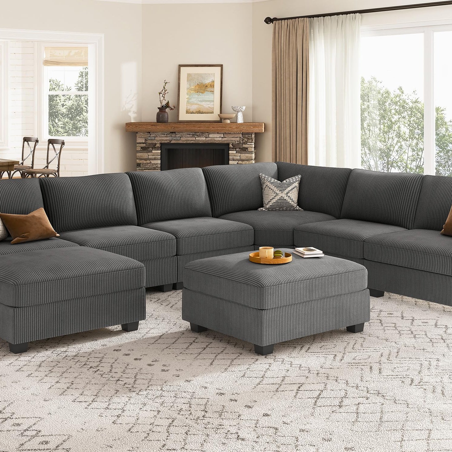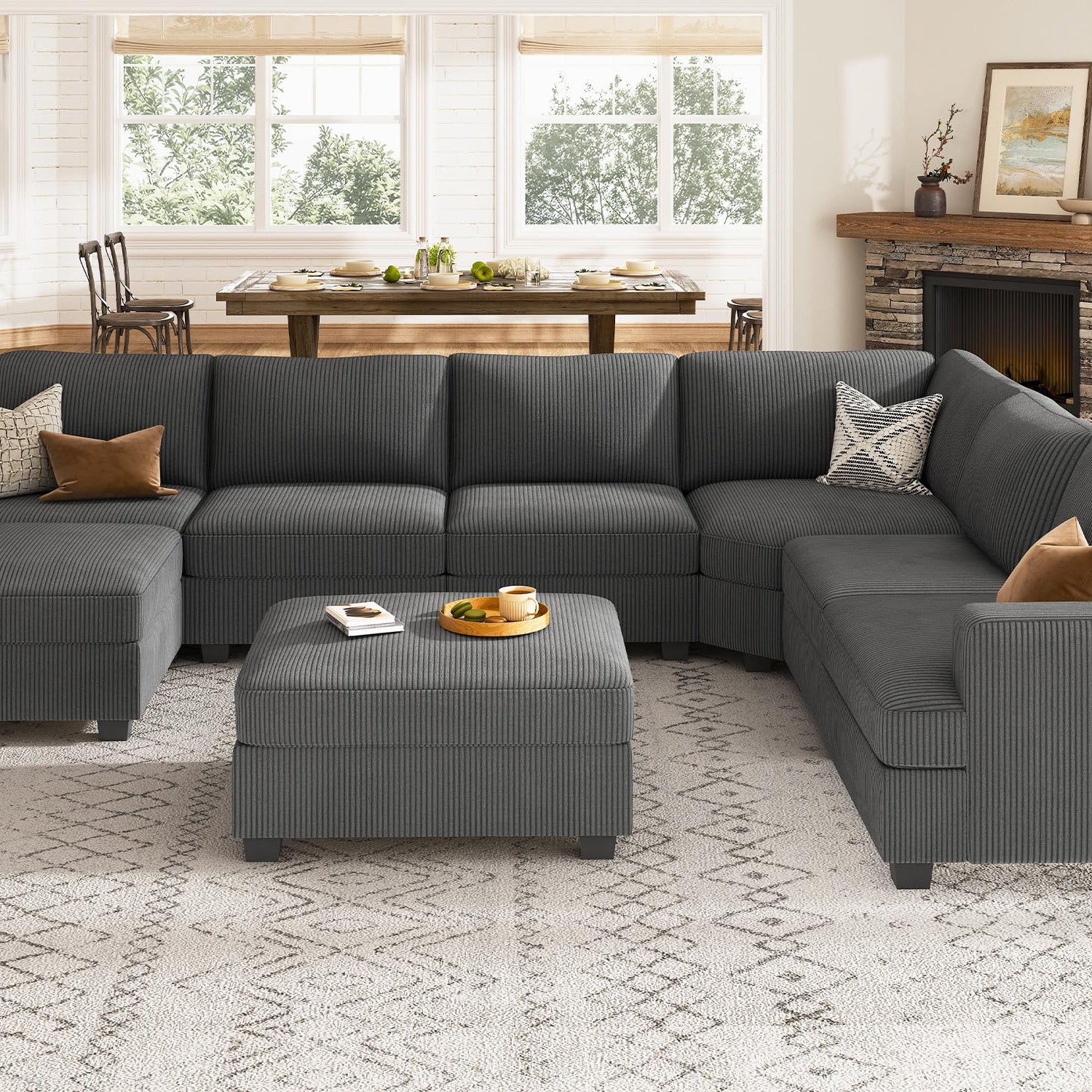 Nolany Sectional Couch with Storage Ottoman, Corduroy Modular Sectional Sofa, U Shape Sectional Couches for Living Room, Dark Grey