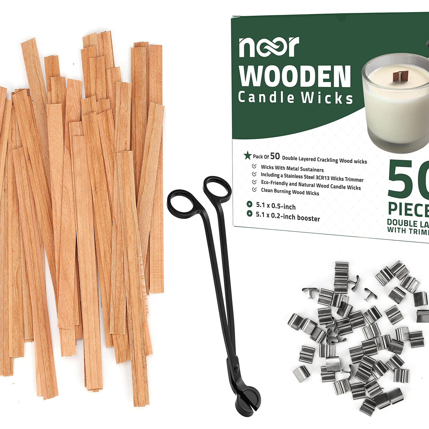 NOOR 50 Pieces Smokeless Wooden Wicks with Trimmer for Candle Making and 5.1 X 0.2 inch Booster - 5.1 X 0.5 inch Crackling Wood Wick for DIY Candles with 50pcs Metal Clips