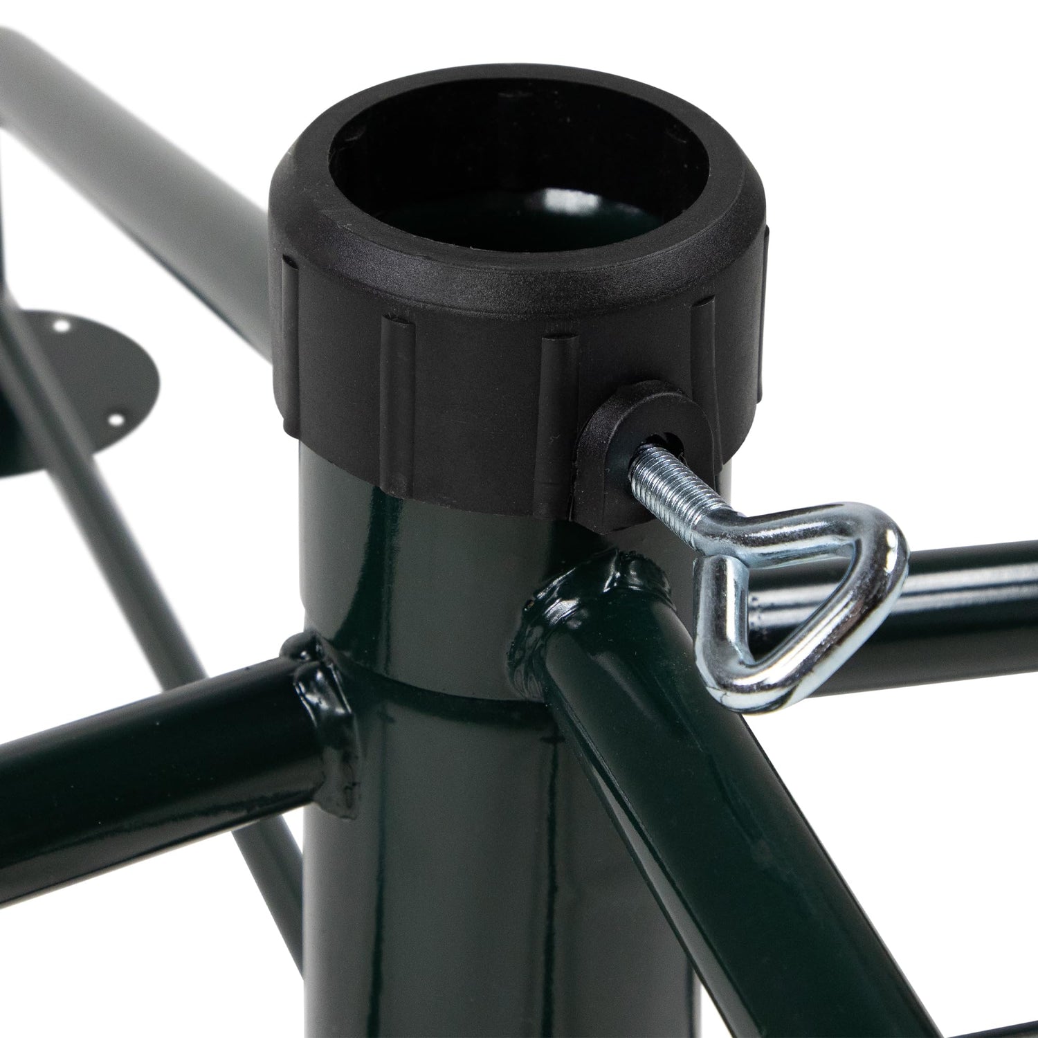 Details: Guarantee that your tree locks into position with this durable metal tree stand! With its bolt to secure the pole, rest assured that your tree and all your favorite decorations will stay exactly where you want them. Featuring stable double bars and stand pads, it's sure to be a staple in your holiday decorations for years to come. Product Features:. Green Christmas tree stand. Folds down for easy storage. Screw bolt on base to lock tree into place. 4.25" stand pads for extra stability. Stand can accommodate a 9'-14' artificial trees. Fits tree poles of 2" in diameter. Recommended for indoor use only Dimensions: 36" long x 10" high. Material(s): metal/plastic