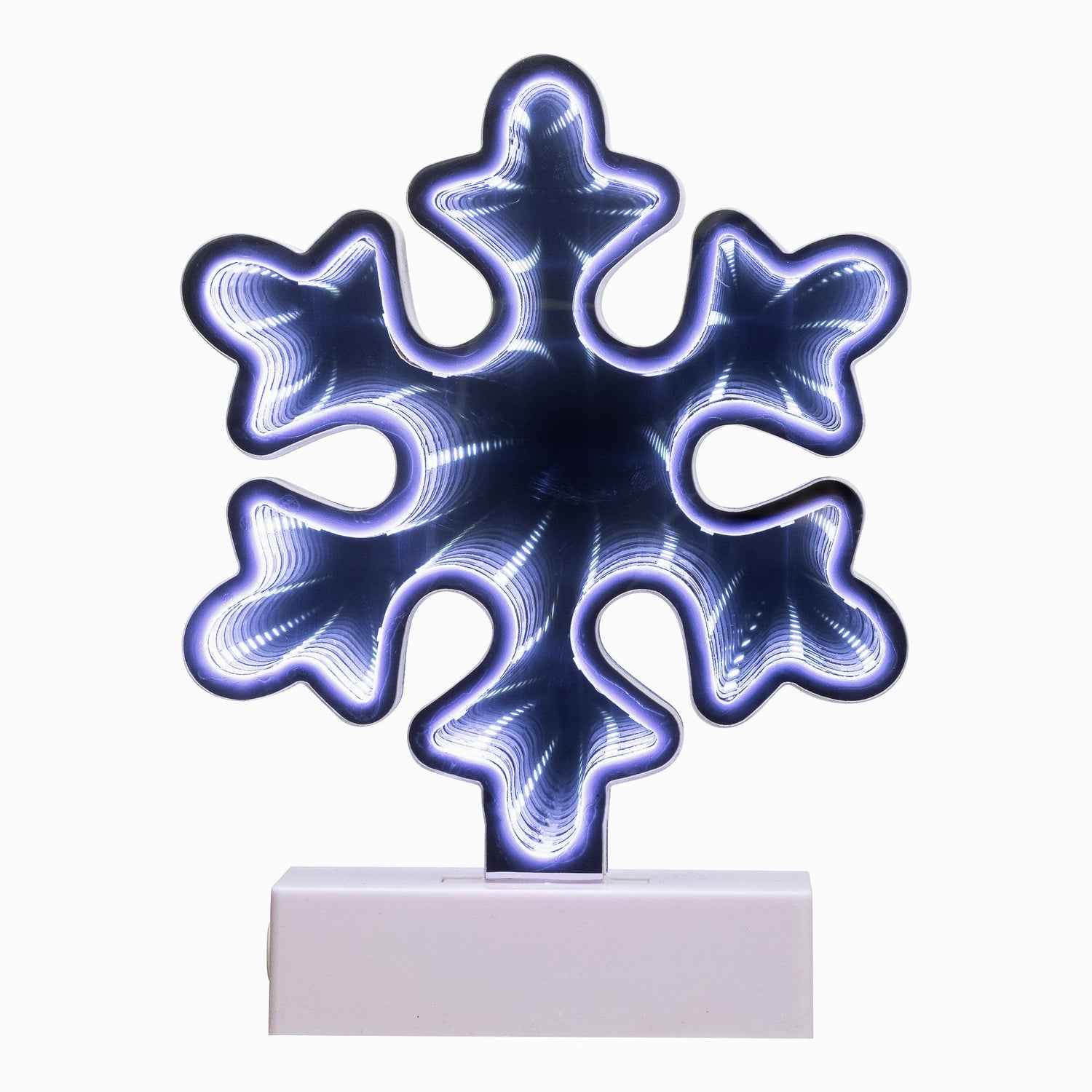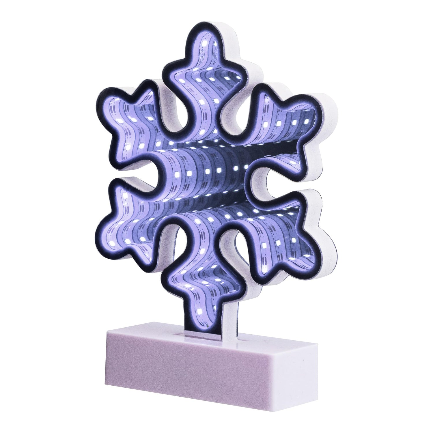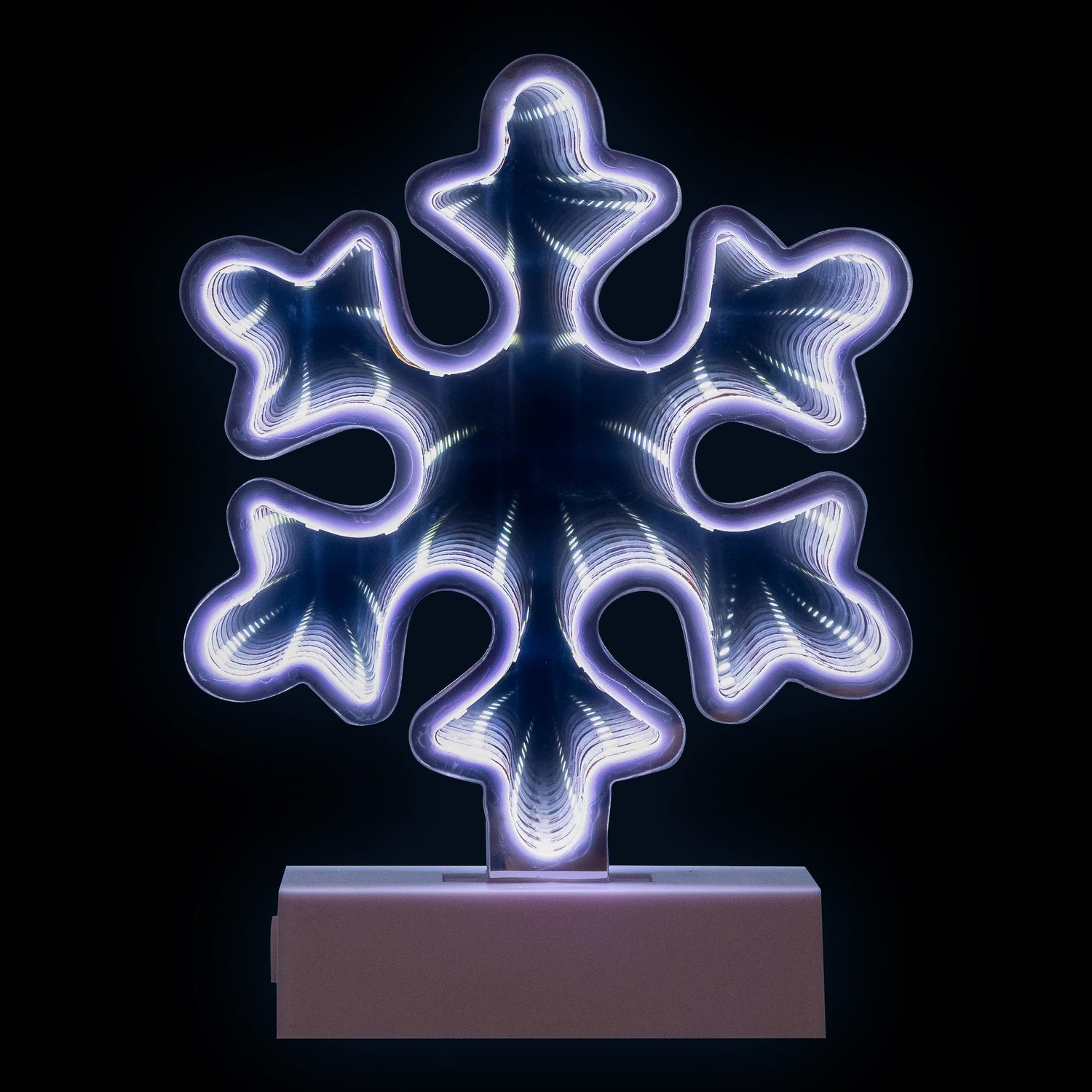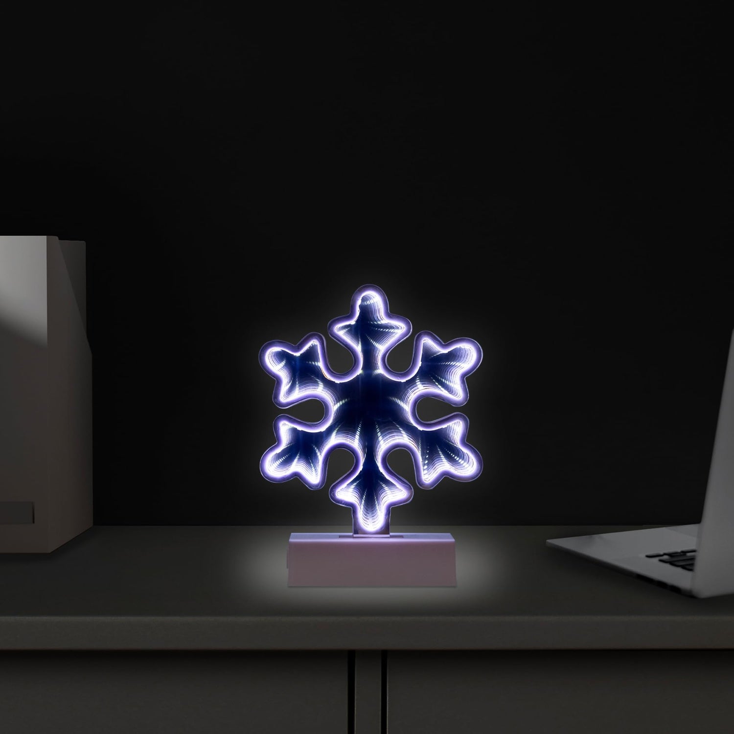 Details: Step into a winter wonderland with the 3D Christmas snowflake infinity mirror. This tabletop masterpiece brings the magic of the holiday season to life with its enchanting display of white LED lights. Whether as a centerpiece for your holiday festivities or a charming accent for your home decor, let this snowflake tunnel light illuminate your celebrations with its holiday charm and warmth. Product Features:. Snowflake infinity mirror. Pre-lit with white LED lights. USB cord included. Can also use 3 "AAA" batteries; not included. On/Off switch located on the bottom. For indoor use only Dimensions: 7.75"H x 5.75"W x 1.75"D. Material(s): plastic