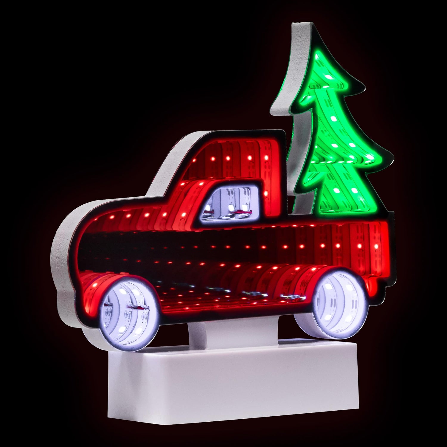 Details: Experience the magic of the holiday season with our LED 3D Christmas truck infinity mirror. Illuminate your space with the festive glow of red, green, and white LED lights, casting a warm and inviting atmosphere. Featuring a charming red truck, adorned with a green tree and white tires. This delightful tabletop decoration captures the spirit of Christmas in every detail. Perfect for adding a touch of whimsy to your home or office décor, this enchanting light brings joy and cheer to any room. Product Features:. Christmas truck infinity mirror. Pre-lit with red, green and white LED lights. USB cord included. Can also use 3 "AAA" batteries; not included. On/Off switch located on the bottom. For indoor use only Dimensions: 7"H x 7.25"W x 1.75"D. Material(s): plastic