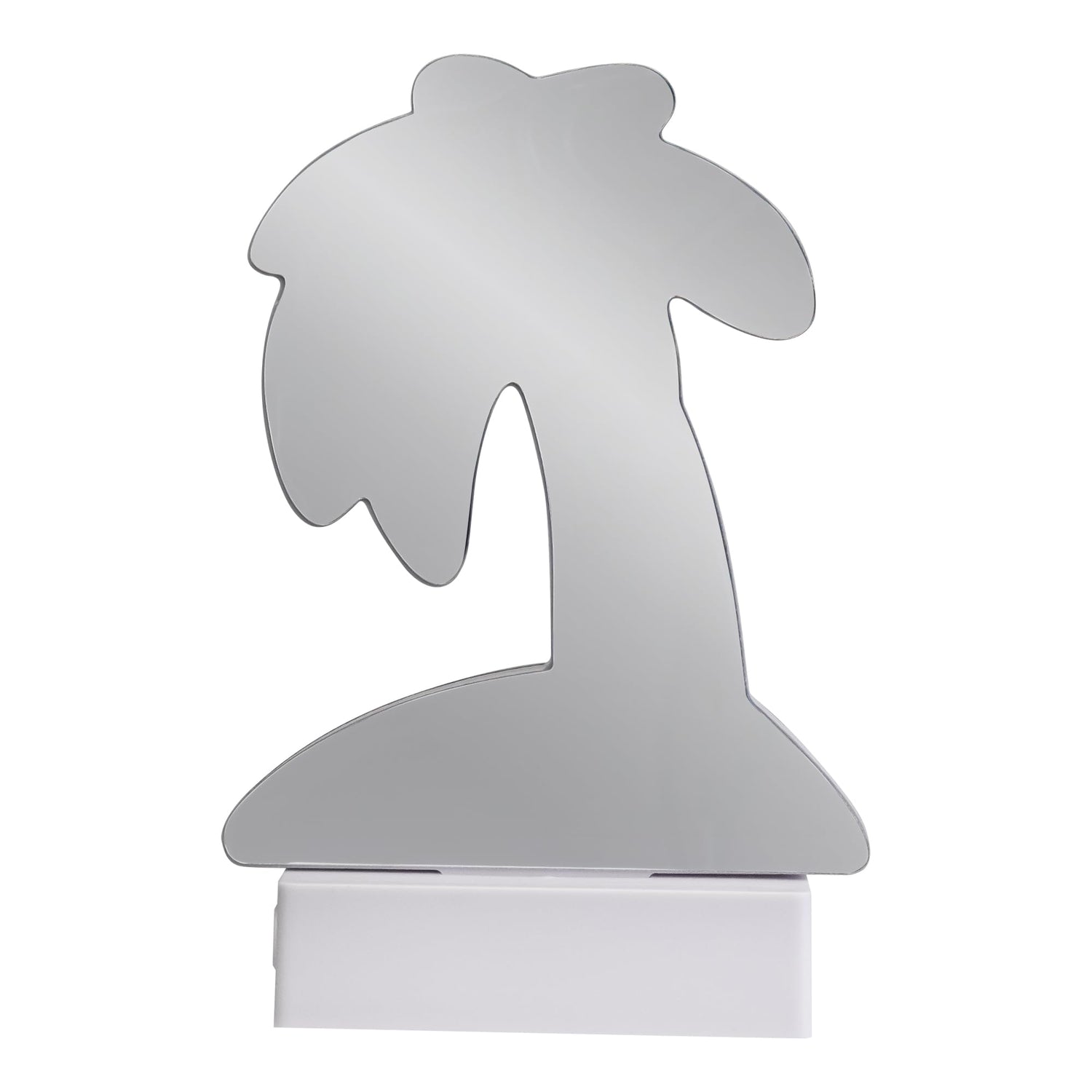 Details: Create a mesmerizing atmosphere with our LED 3D palm tree infinity mirror. Crafted to add a tropical touch to any space, this captivating piece features vibrant green, purple, and white LED lights, illuminating your surroundings with a playful and soothing glow. Perfect for enhancing your home decor, parties, or relaxation spaces. This palm tree light brings a touch of paradise wherever it's placed. Whether as a centerpiece or accent piece, let its enchanting radiance transport you to a tranquil oasis. Product Features:. Palm tree infinity mirror. Pre-lit with purple, green and white LED lights. USB cord included. Can also use 3 "AAA" batteries; not included. On/Off switch located on the bottom. For indoor use only Dimensions: 8"H x 5.25"W x 1.75"D. Material(s): plastic