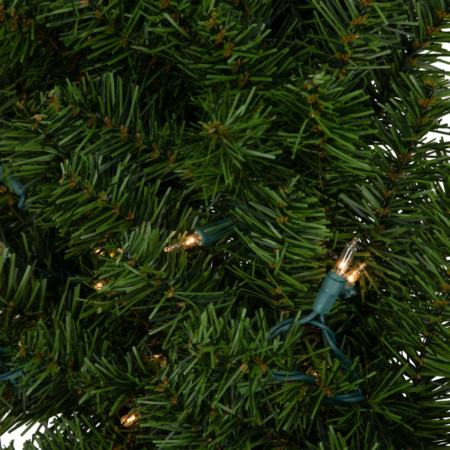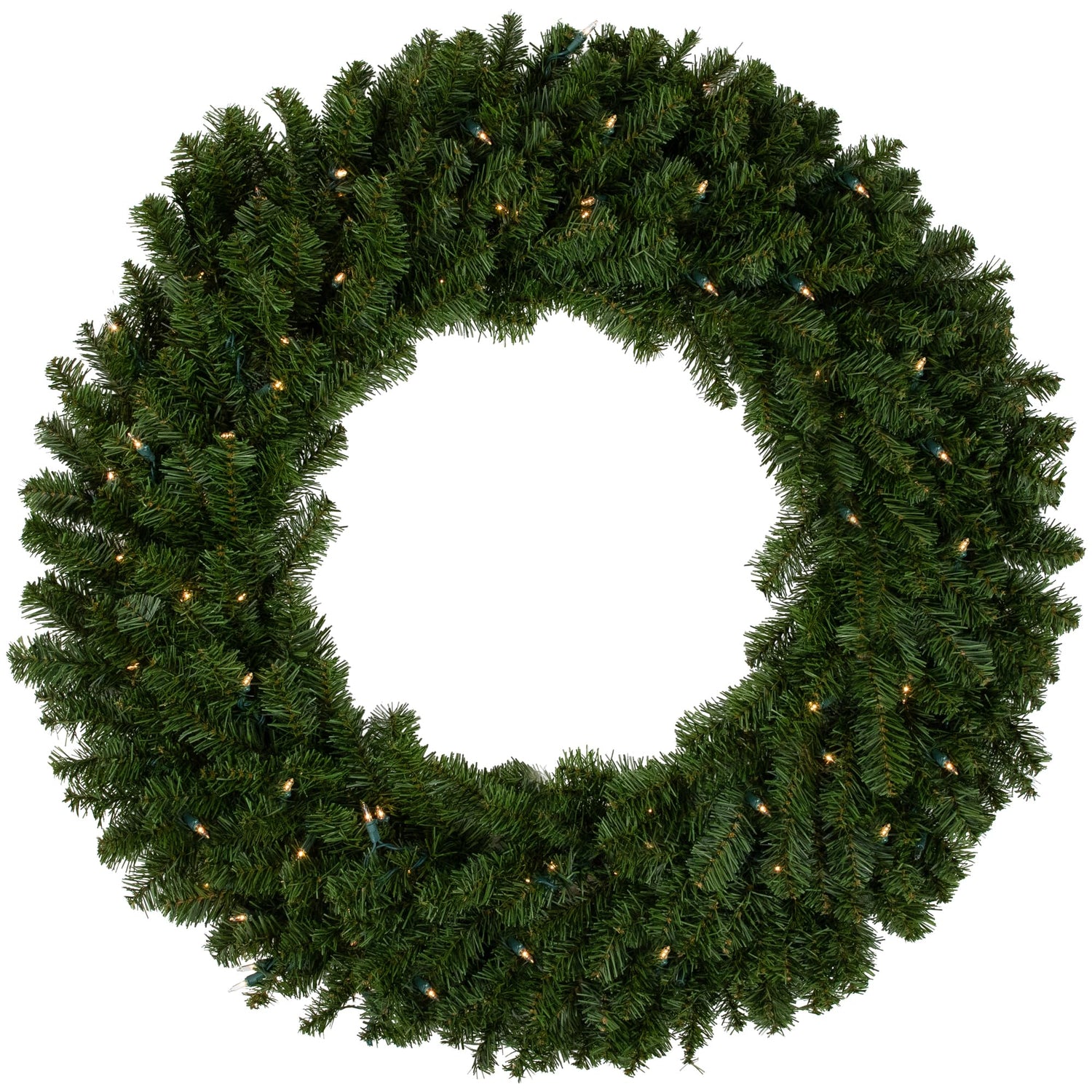 Details: This classical Canadian pine is made up from two-tone forest green tips for a lush, full and dimensional look. This wreath is durable and beautiful enough to use year after year even with the ever changing trends. Features an abundance of clear incandescent lights, providing a soft traditional glow. Features: Two-tone medium green foliage 360 tips Pre-lit with 150 clear lights. Bulb size: mini No assembly required, wreath comes in 1 piece Includes a heavy duty double ring metal frame backing for hanging. 35.5 inch green lead cord Additional product features: Flame retardant. Super bright bulbs. If one bulb burns out the rest will stay lit. Lights are equipped with Lamp Lock feature, which makes them replaceable, interchangeable and keeps them from falling out Contains end connector which allows you to connect multiple lighted items together (not to exceed 210 watts) Lights are UL listed for indoor or outdoor use, however wreath is recommended for indoor use Comes with replacement bulbs, flasher bulbs and spare fuses. 120 volts, 60 hertz, .34 amps, 40.8 watts Dimensions:. Overall: 4" high x 36" diameter (measured from outermost tip to outermost tip across the wreath). Exterior of frame: 26" diameter. Interior of frame: 20" diameter Material(s): PVC/metal/glass bulbs/wireNote: Branches are compressed for shipment, and need to be fluffed out upon arrival to look like the photo.