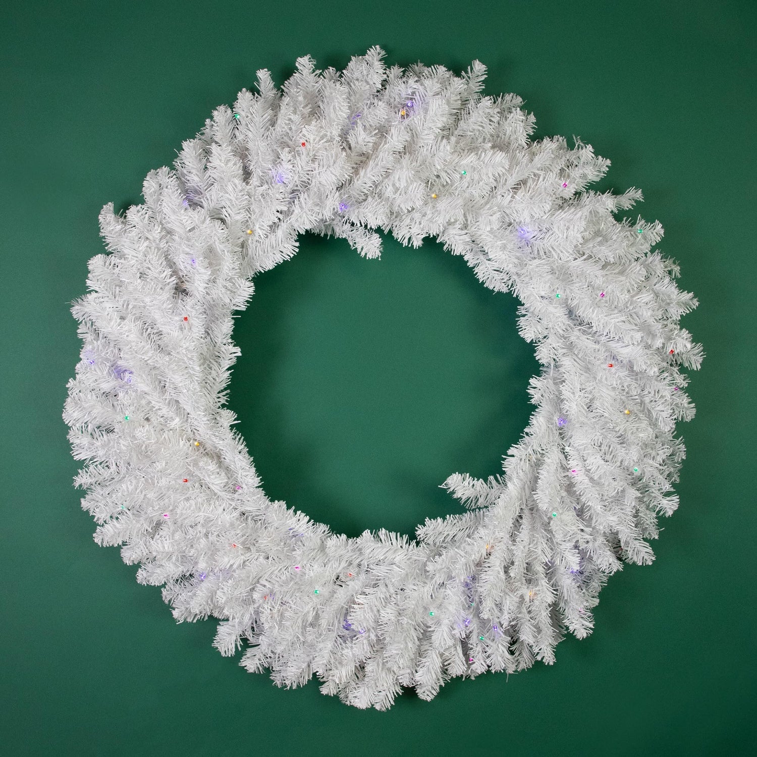 Details: Enhance your holiday ambiance with our battery operated lighted white Canadian Pine LED Christmas wreath. This stunning wreath features a beautiful blend of realistic white pine branches, adorned with multicolor LED lights that will fill your home with festive brilliance. Designed for convenience, this wreath is battery operated, allowing you to place it anywhere you desire without the need for cumbersome cords or outlets. The built-in timer function ensures effortless operation, allowing you to set it and forget it, as the wreath automatically illuminates for a magical display every evening. Product Features:. Pre-lit with 100 multi-color LED lights. Multi-color consists of red, yellow, green, blue, purple and pink. Bulb size: concave wide angle. 380 branch tips. 1.25" wide tapered tips Additional Product Features:. LED lights use 90% less energy. Durable non-glass replaceable bulbs. Cool to the touch. Requires (3) "AA" size batteries (not included). Convenient on/off button and timer located on the battery pack. The timer will run continually: 6 hours on and 18 hours off and repeat until deactivated by pressing the on/off button. Light sets on the wreath are UL certified and approved for indoor or outdoor use, however, the wreath itself is recommended for indoor use. If one bulb burns out, the rest will stay lit. No assembly required - wreath comes in 1 piece. Includes a heavy duty ring metal frame backing for hanging. Cannot be connected with other lighted items Dimensions: 36" diameter (measured from outermost tip/edge to outermost tip/edge across the wreath). Inner ring dimensions: 19.5"- 25" diameter. Material(s): PVC/metal/plastic bulbs/wire Note: Branches are compressed for shipment, and need to be fluffed out upon arrival to look like the photo.