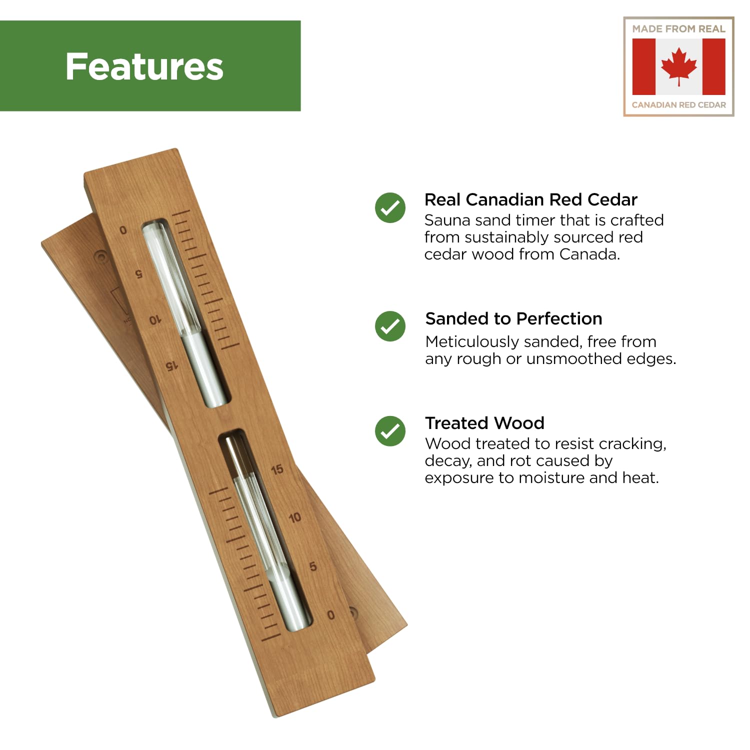 - Real Canadian Cedar: Our Cedar Sauna Sand Timer is made from the highest quality Canadian Red Cedar wood to provide a classic look and superior sense of touch, smell and unrivaled durability