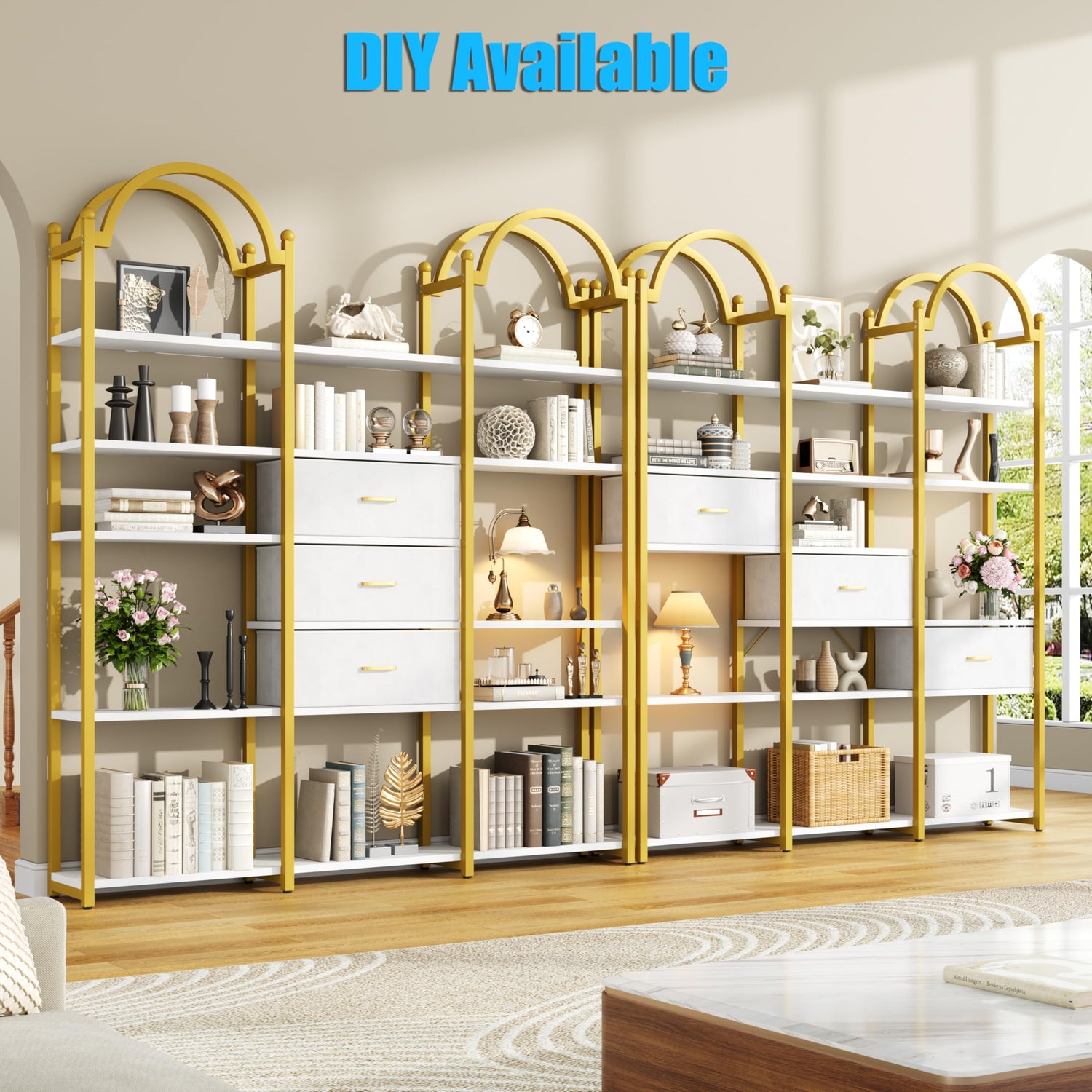 Nosepen 83.5" Tall Arched Bookshelf with 3 Drawers and 13 Storage Shelves, Industrial Open Book Shelf with Display Shelves, Large Etagere Bookshelf, Triple Wide Book Case for Home & Office, Gold
