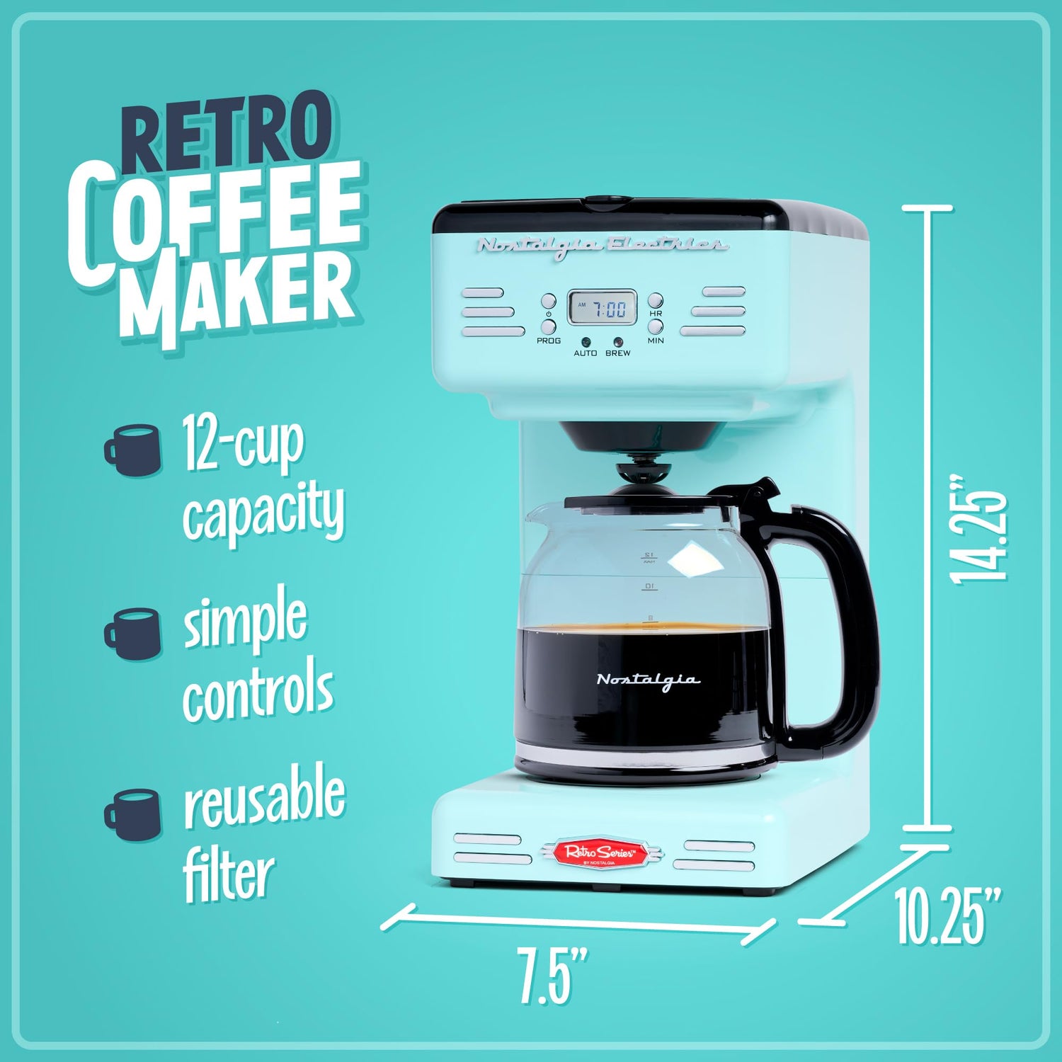 Nostalgia Retro 12-Cup Programmable Coffee Maker With LED Display, Automatic Shut-Off & Keep Warm, Pause-And-Serve Function, Aqua