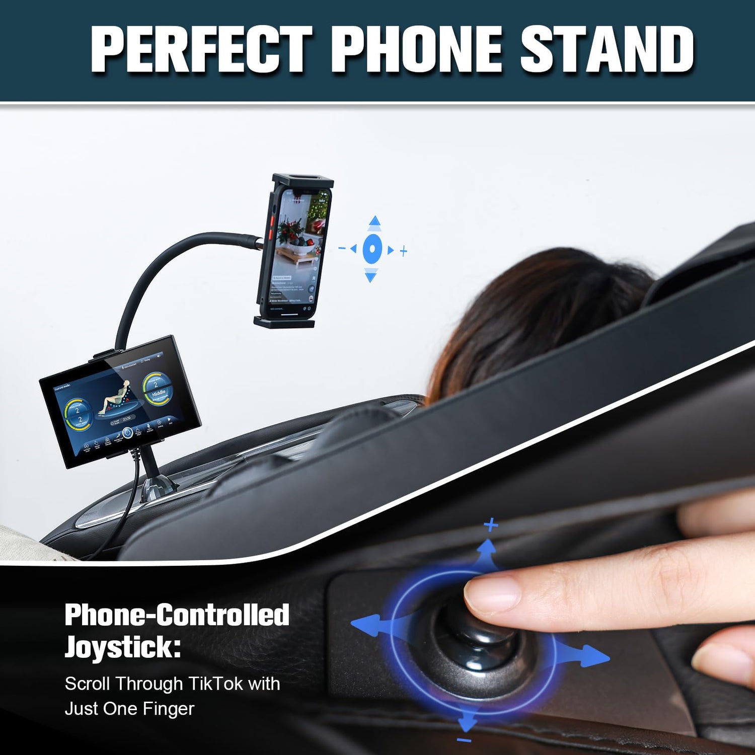 - Phone Holder, Joystick & Charging Options: Phone holder for easy viewing, while the Bluetooth-connected joystick lets you scroll through videos and adjust volume without interrupting your massage. Additionally, the wireless charging pad and USB port ensure your devices stay powered