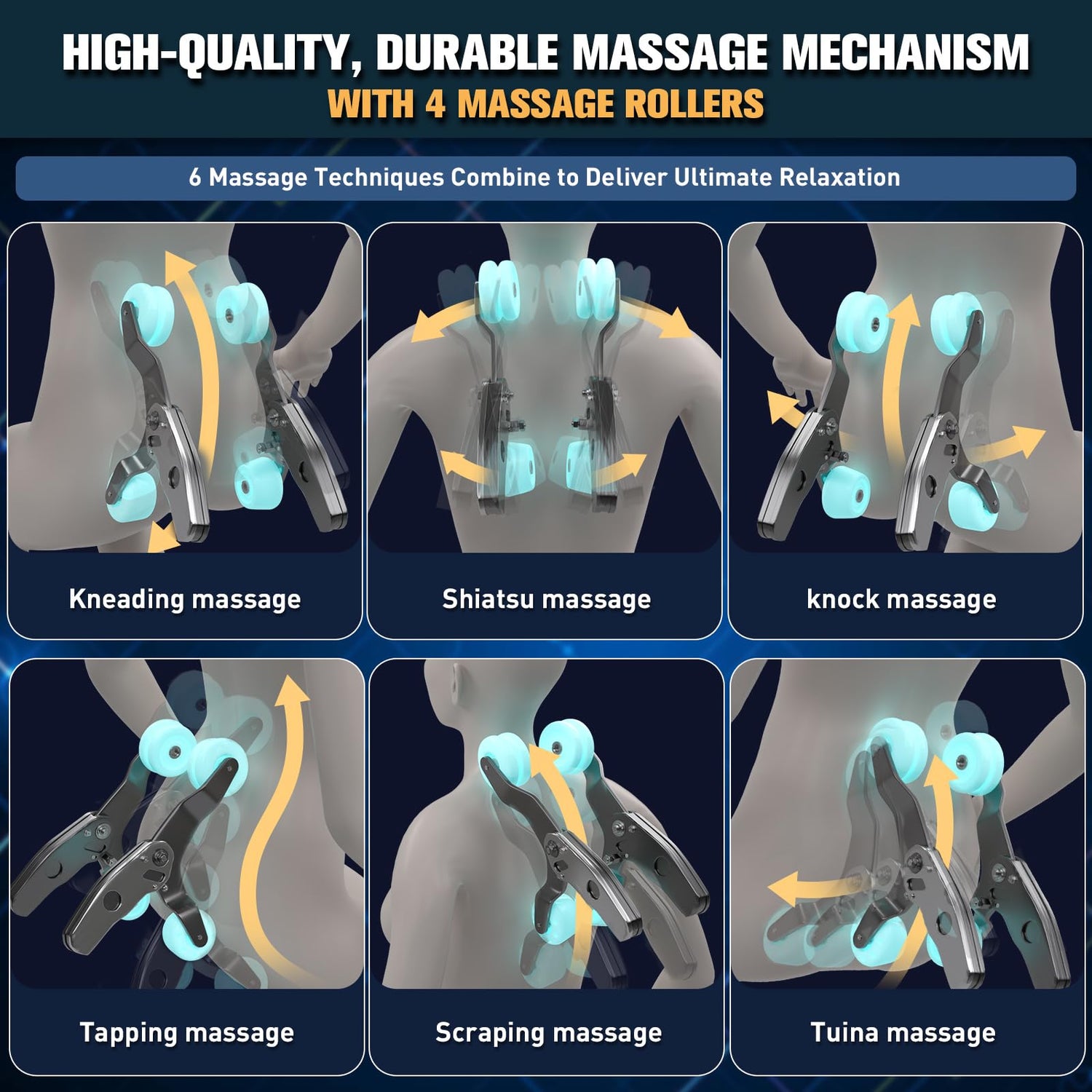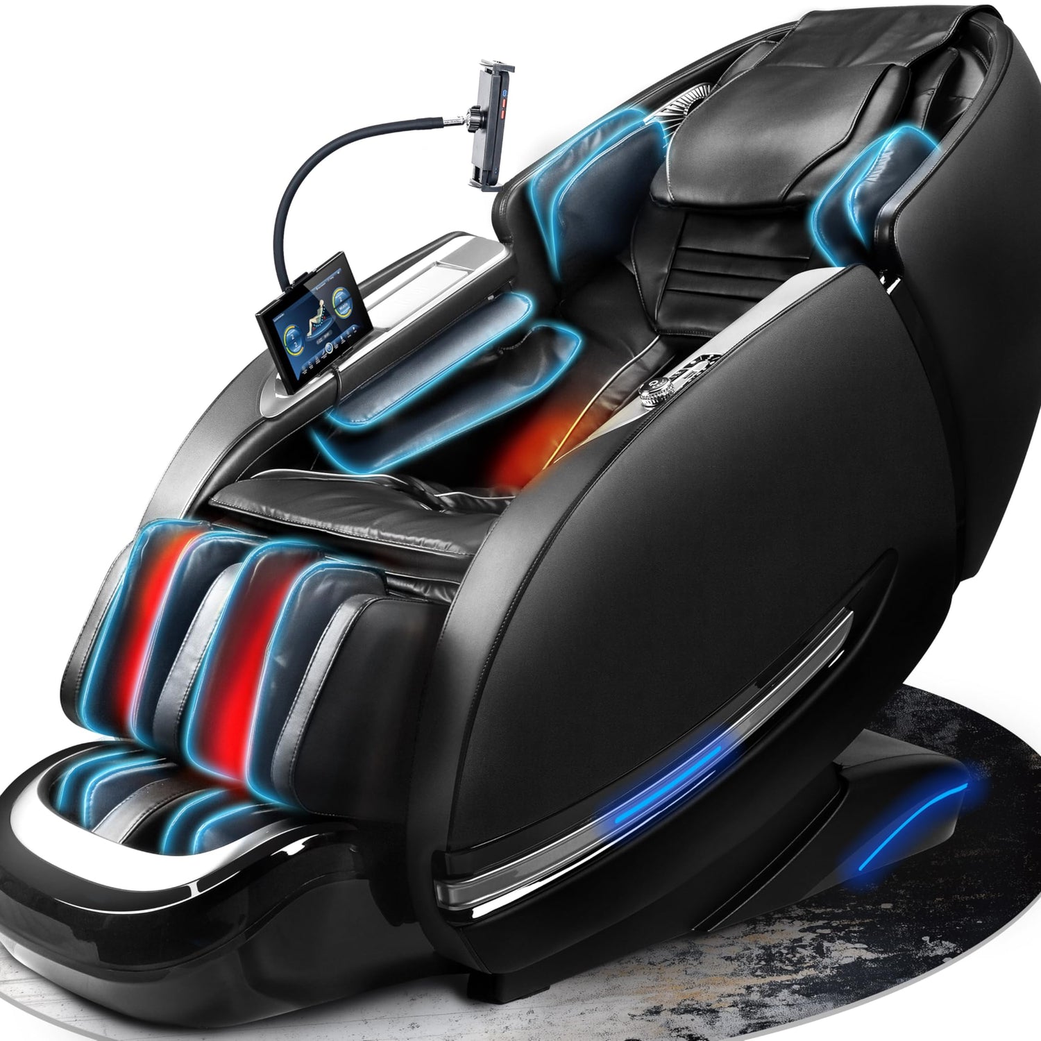 - 8 Massage Techniques & 12 Preset Modes: Includes kneading, shiatsu, knocking, tapping, scraping, tuina, foot roller, and airbag massage, along with 12 preset modes. It also features heating for the waist and calves, plus adjustable massage speed and air pressure for a fully personalized experience