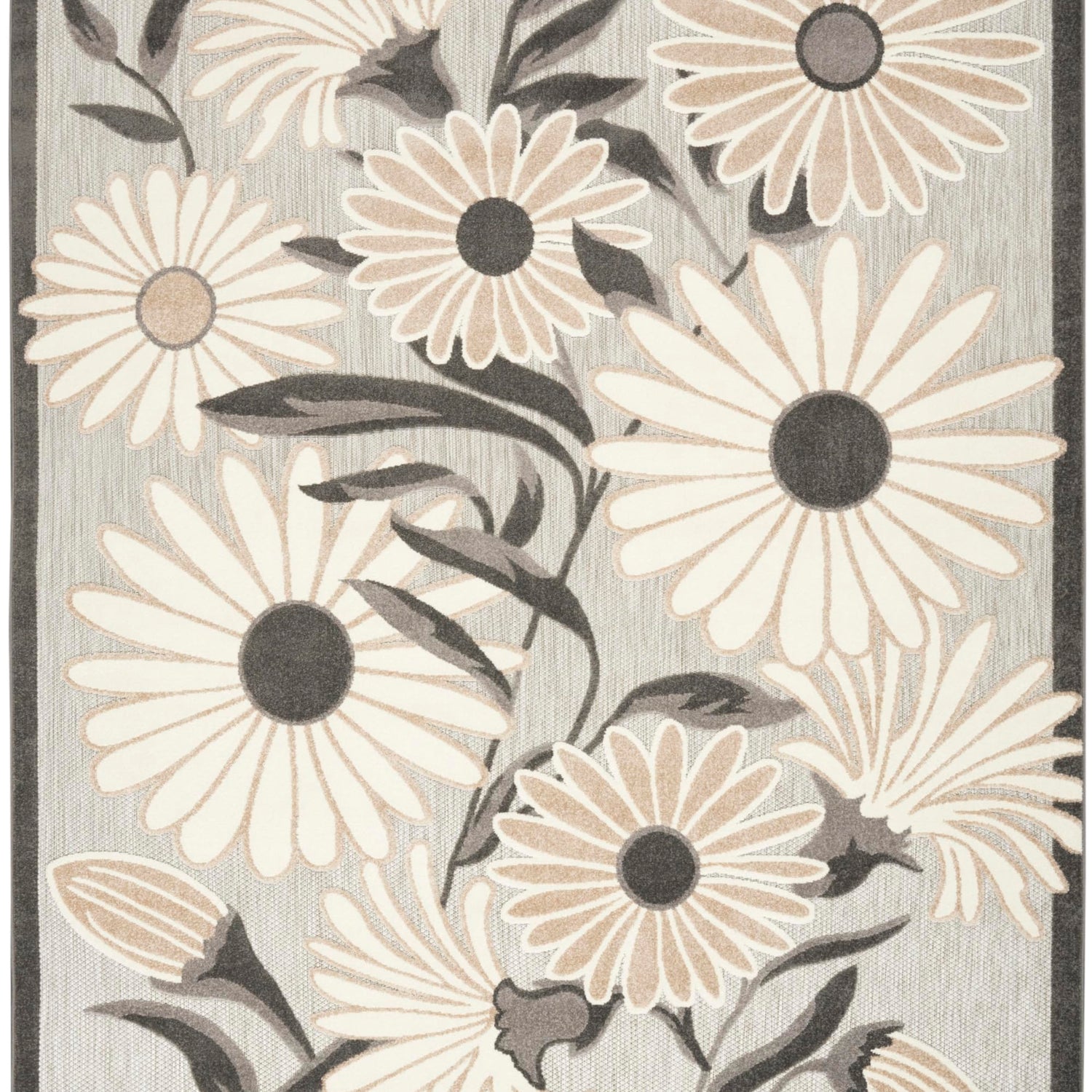 Details: This sunny and sensational collection of flat woven outdoor rugs is pretty, practical and simply perfect for high traffic areas. With its inviting assortment of classic and contemporary designs, tempting color palettes and terrific textures, these multipurpose rugs will afford an air of simple sophistication to any environment.100% Polypropylene • Flat Woven Bring a touch of nature to your floors with this beige floral outdoor rug from the Aloha Collection. The oversized daisy pattern truly pops thanks to a subtly raised finish that adds a surprisingly soft texture to the flatwoven surface. Made from durable, stain-resistant polypropylene yarns that are easy to clean, this contemporary rug pulls double duty as a foundation for both your indoor and outdoor spaces.