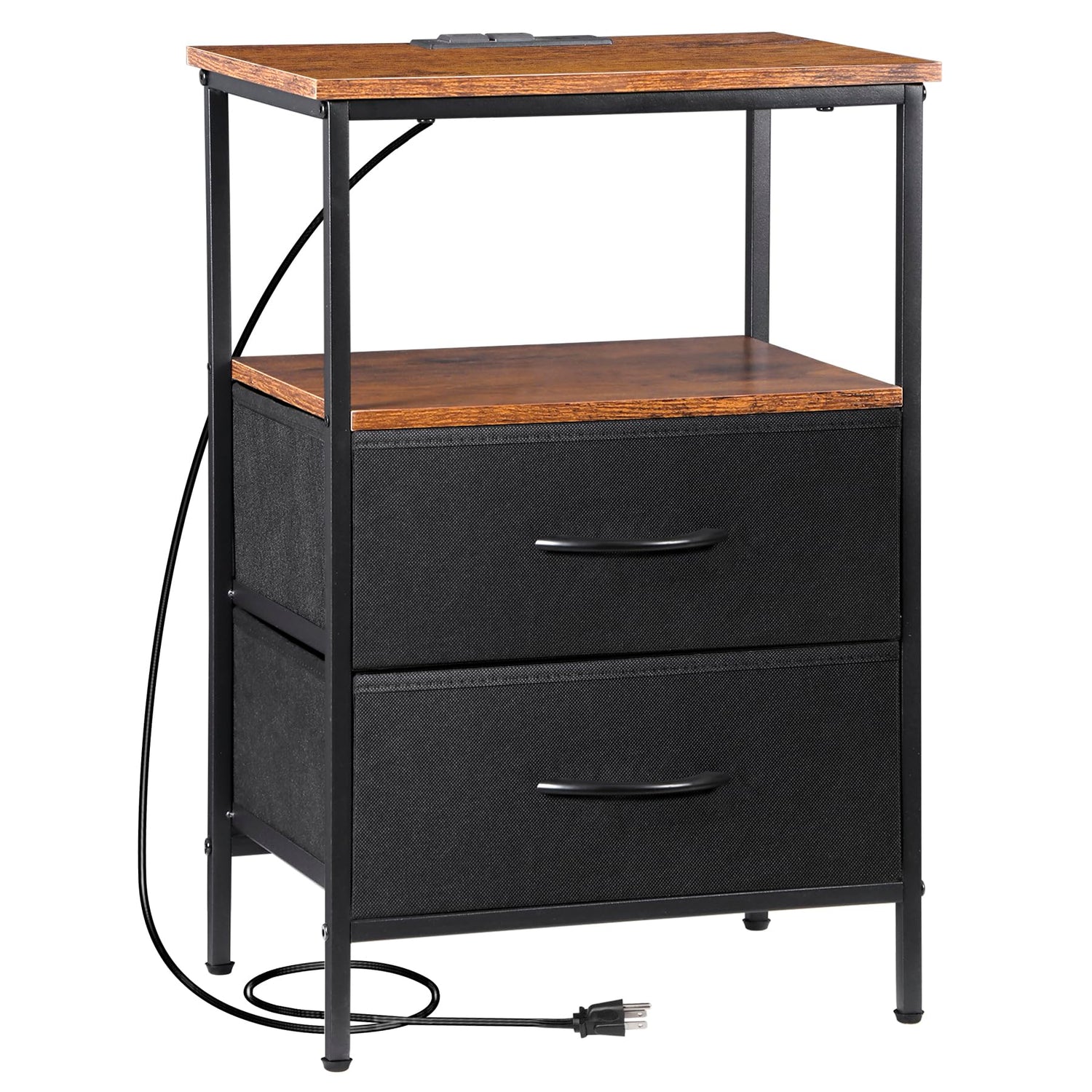 Nouva Nightstands Set of 2 with Charging Station, End Table Side Table Night Stand Bedside Table Furniture w/ 4 Fabric Drawers, USB Ports & Outlets,Metal Frame for Bedroom,Rustic Brown