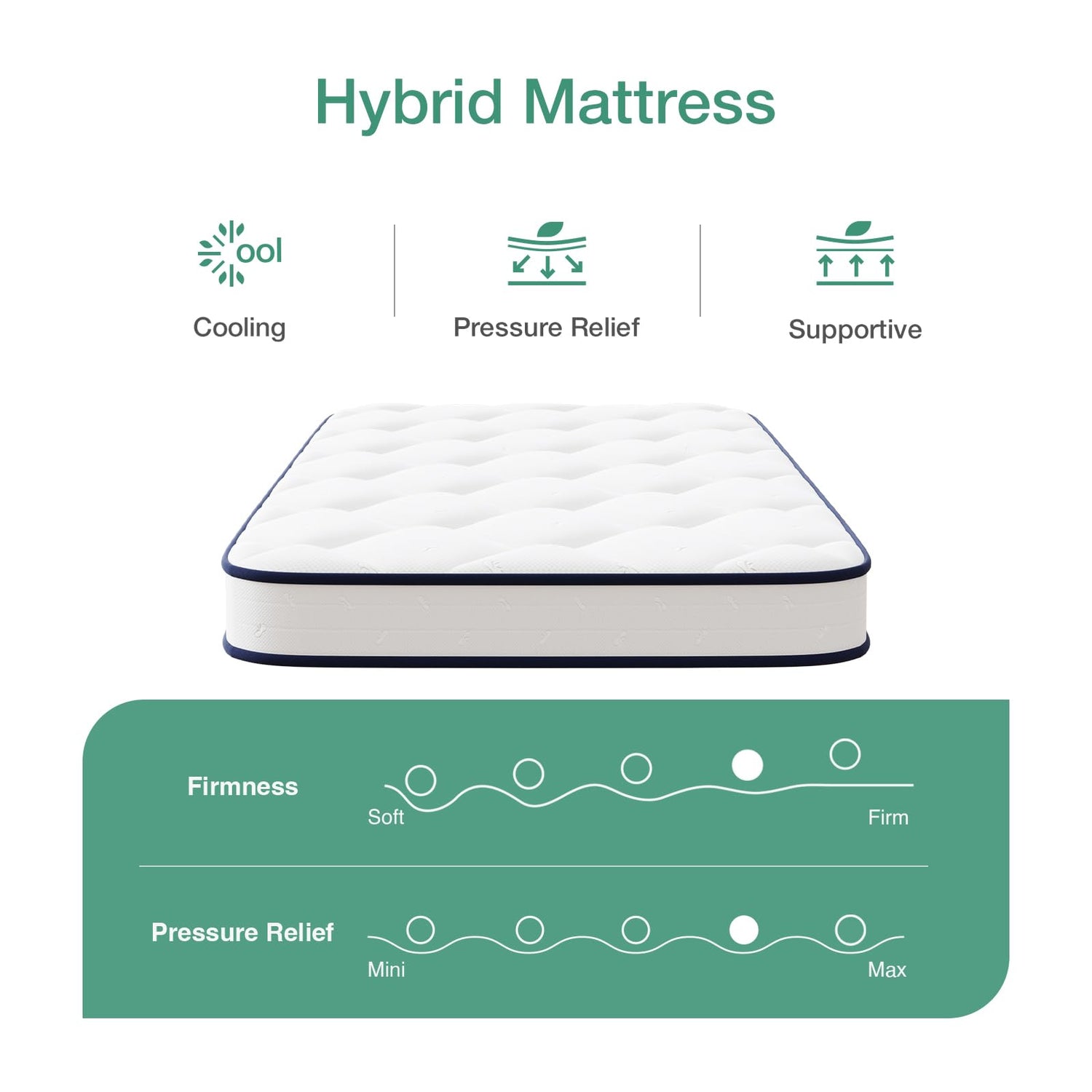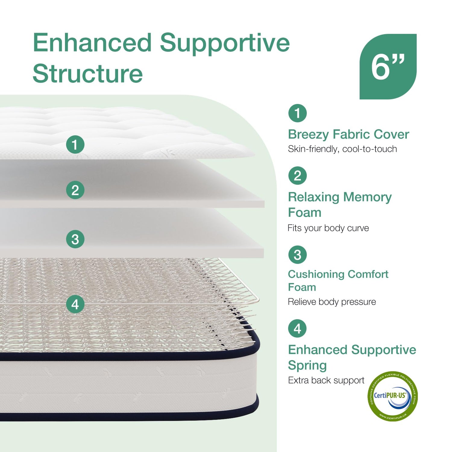 - Certified Safe Hybrid Mattress for Better Sleep:The twin mattress 6 inch crafted with CertiPUR-US certified foam and an OEKO-TEX certified mattress cover,making it a satisfying option for those with allergies or skin sensitivities.The comfort layers are made of different materials and densities of foam to offer premium support and comfort for a full night's sleep.