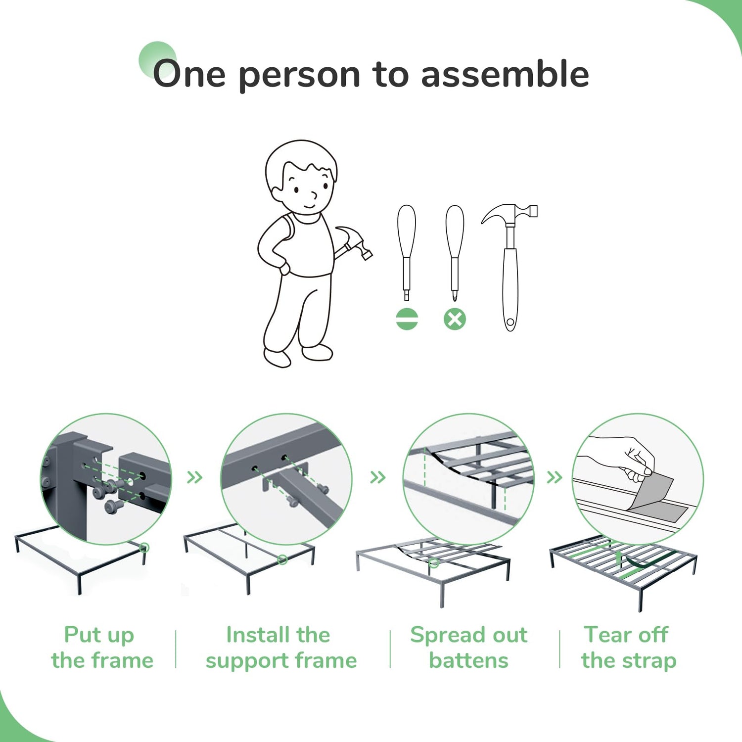 - Easy Assembly: When you receive our metal bed frame, it comes with all necessary parts and a detailed instruction manual. Following the clear instructions, you can assemble the bed in just 20 minutes, making it ideal for bedrooms, guest rooms, dorms, and hotels.