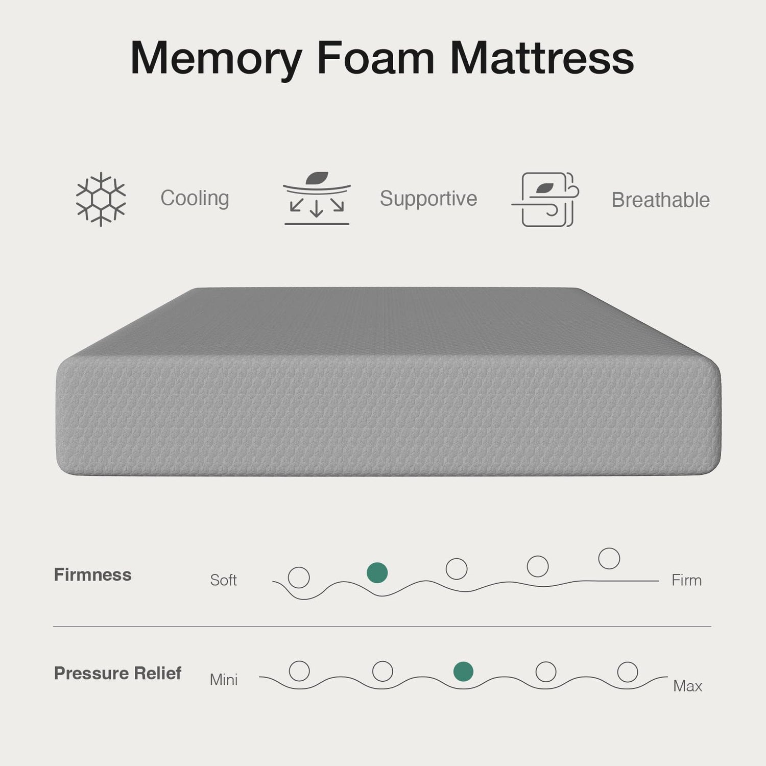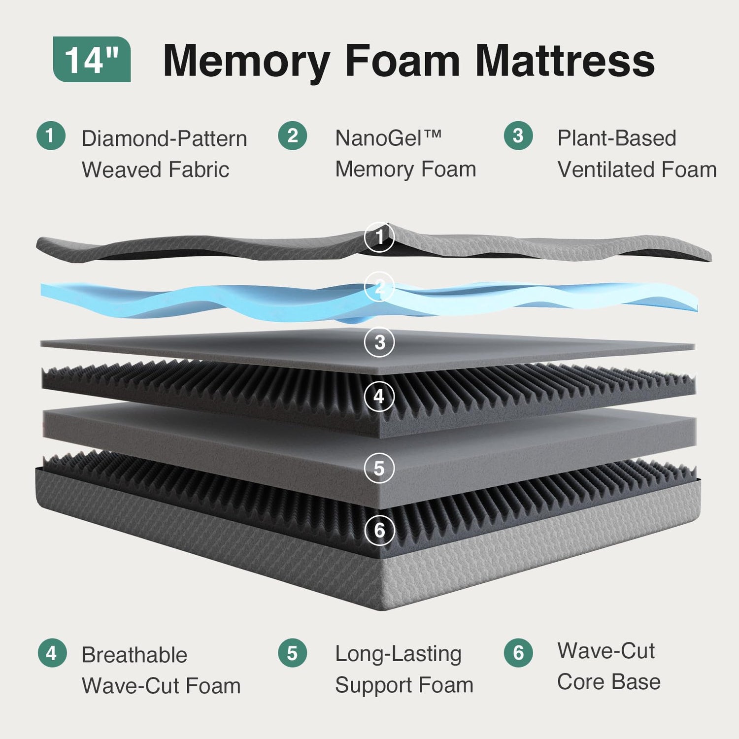 - Gain Ultimate Cooling Without Losing Support -Breathable knit and temperature-regulating NanoGel memory foam on top avoid trapped warmth and night sweats during sleep, also the BambooIrons core with wave design boosts airflow by 30% to keep the continuous freshness of the full mattress while providing durable support.