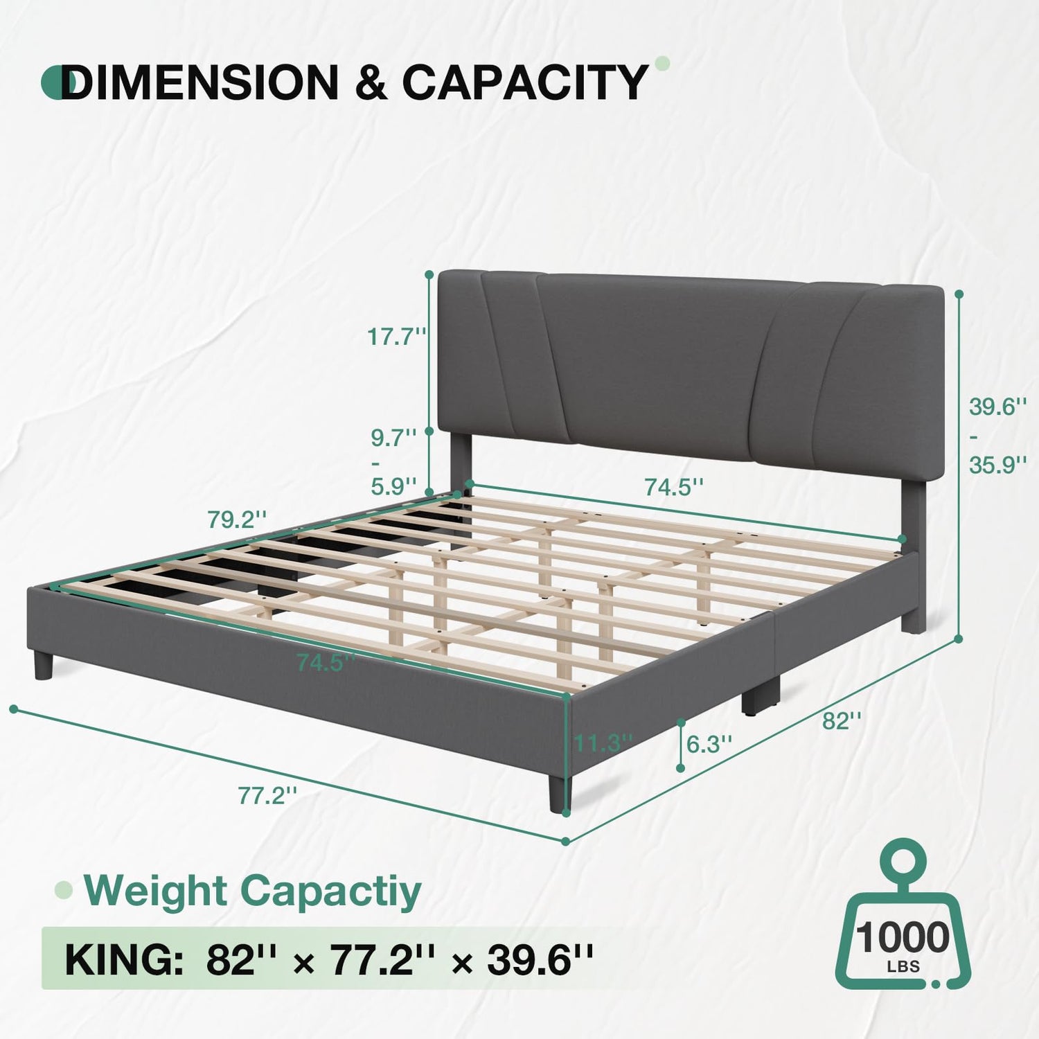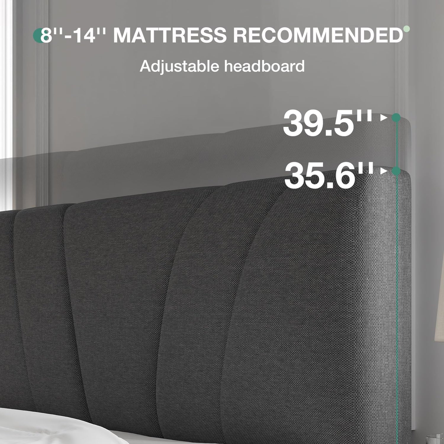 - 35.9"-39.6" Adjustable Height Headboard: Our king size bed frame features a 3.7 inch height-adjustable headboard (35.9"-39.6"), designed for mattresses 8-12 inches thick. Easily customize the height to match your mattress thickness while maintaining a tailored look for your bedroom setup.