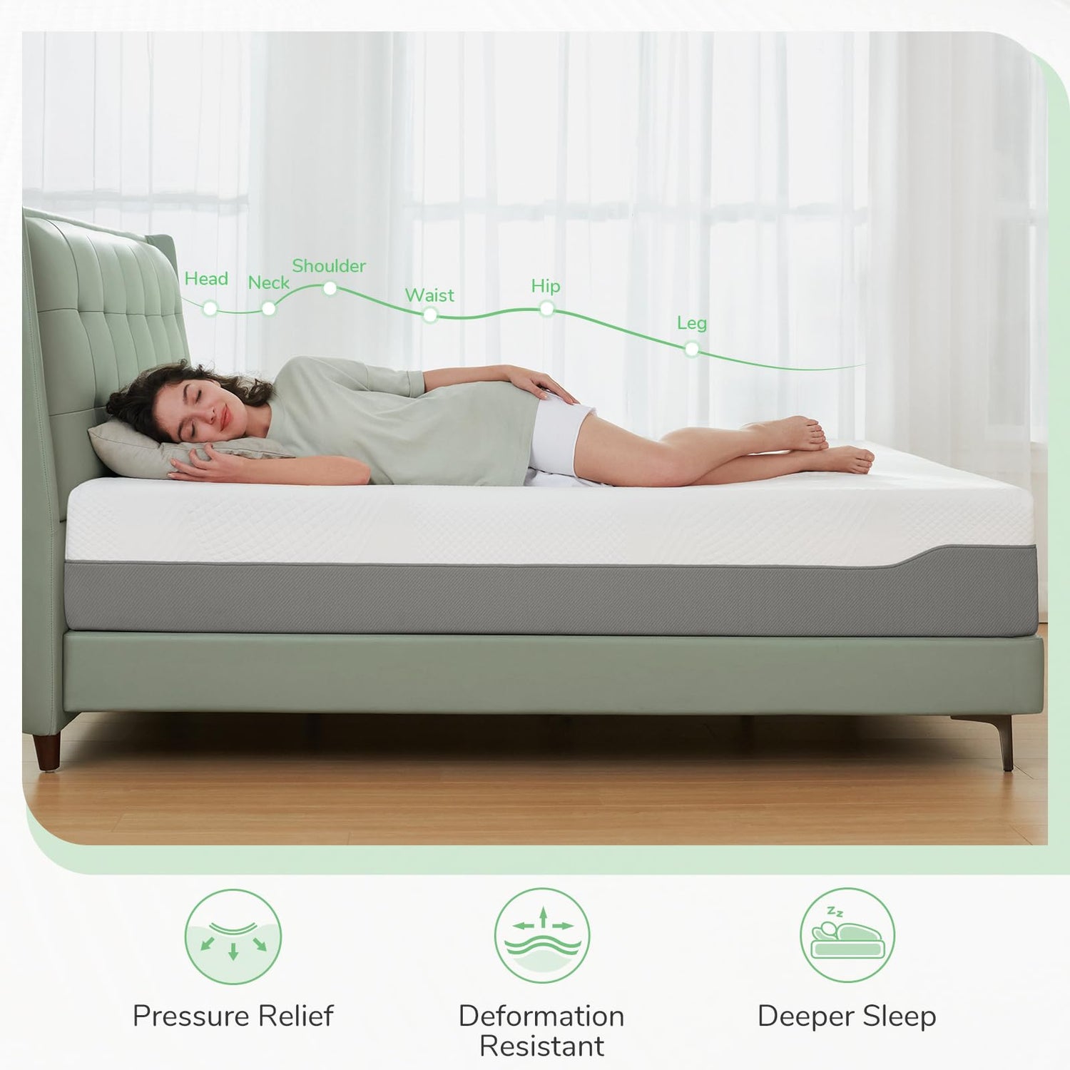 - [ERGONOMIC DESIGN TO RELIEVE PRESSURE] This king size mattress is designed with gel-infused memory foam that conforms to your body and distributes weight evenly, promoting muscle relaxation and spinal alignment. The two other high-density foam layers provide enhanced body support. Whether you're a side sleeper, back sleeper, or stomach sleeper, your king foam mattress has got you covered.