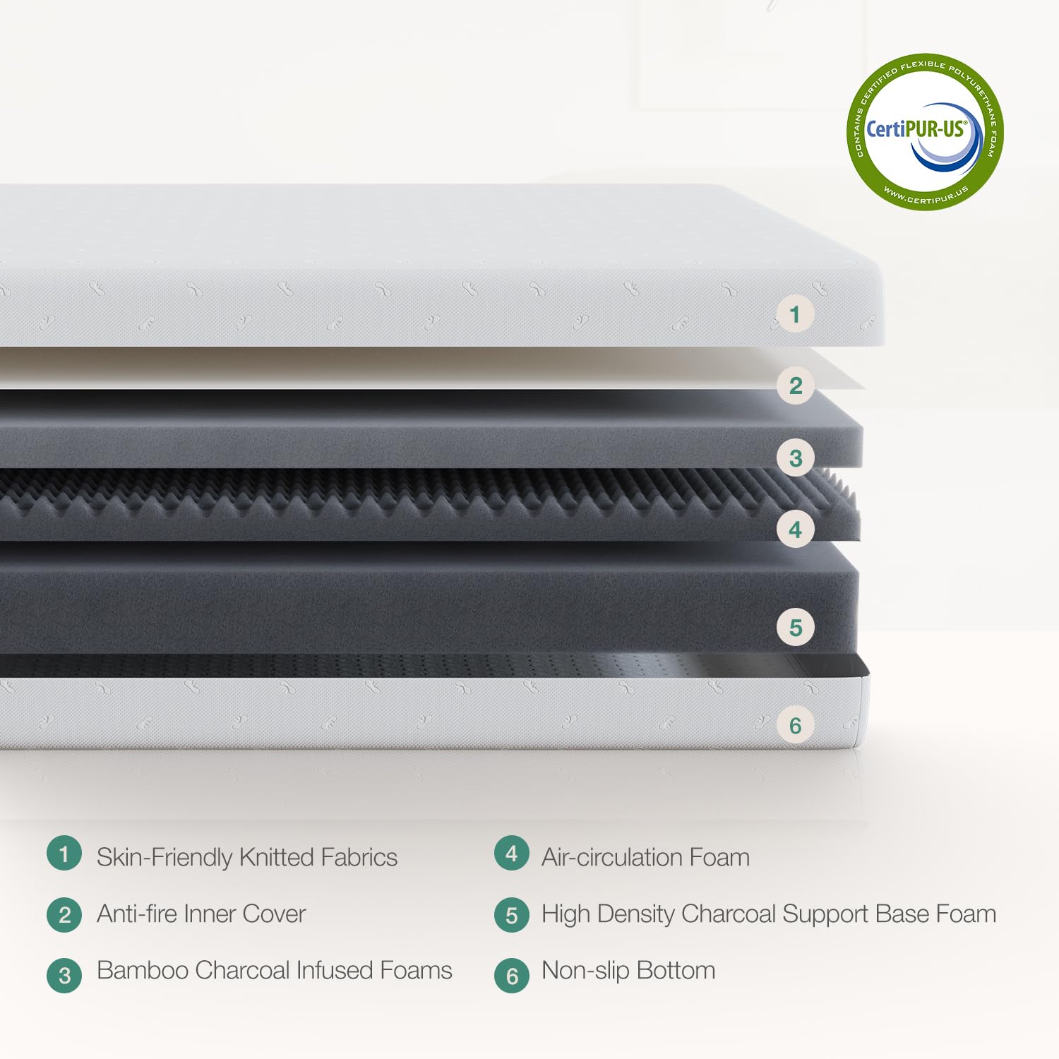 - CertiPUR-US CERTIFIED ENSURES HEALTHY SLEEP - The Novilla king mattress is designed with a 3-layer foam system for better support and comfort. The mattress layers consist of 3"comfort foam , 3" egg crate foam and 6" high-density support Base Foam. The comfort foam adsorbs moisture and helps keep the sleep surface cool, providing you with a fresh and clean sleeping environment.