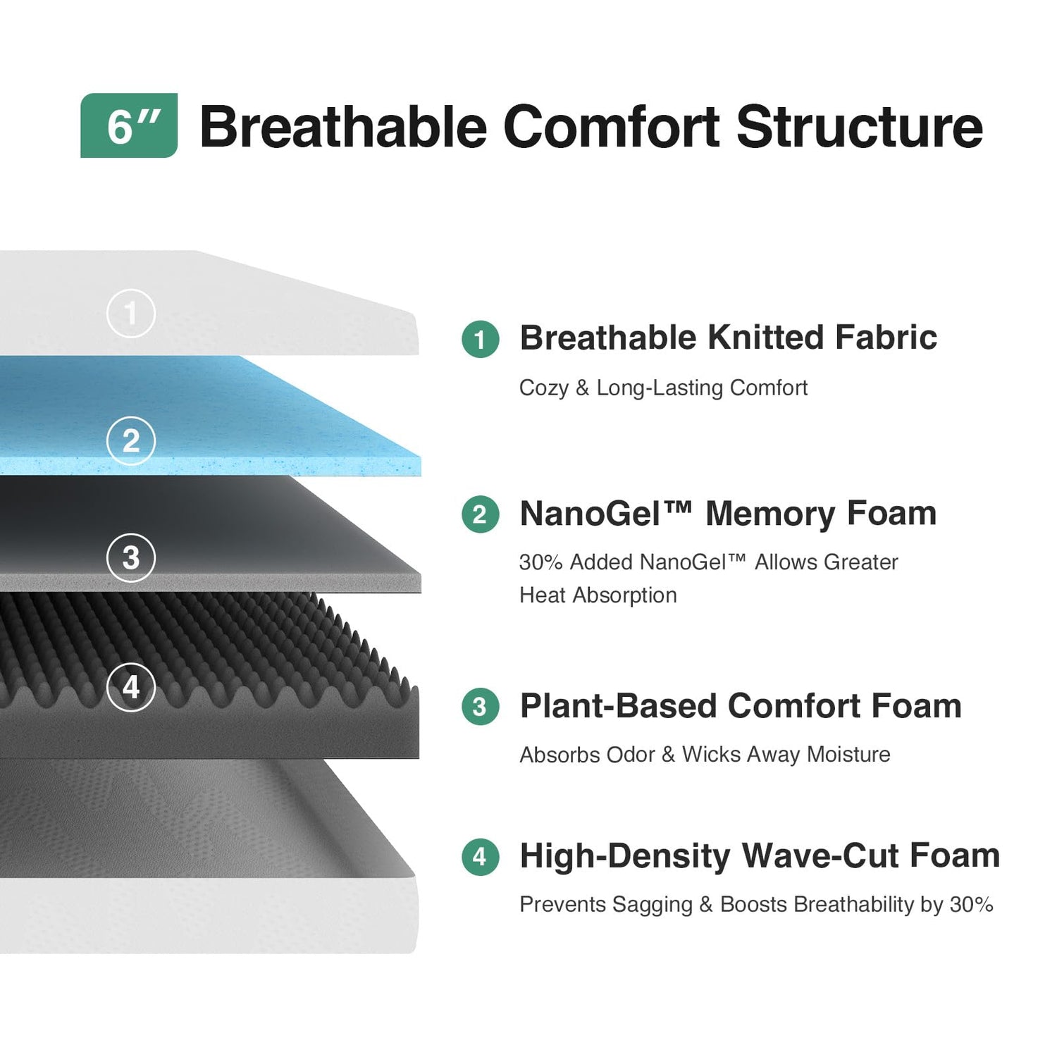 - Cooling & Breathable - The Novilla 6 inch twin bed mattress includes NanoGel memory foam and wave-cut foam, which increases breathability by 30%, promotes airflow and provides a refreshing cooling effect, thereby delivering an enhanced sleep experience. Enjoy all-night comfort and relaxation, say goodbye hot and restless nights.