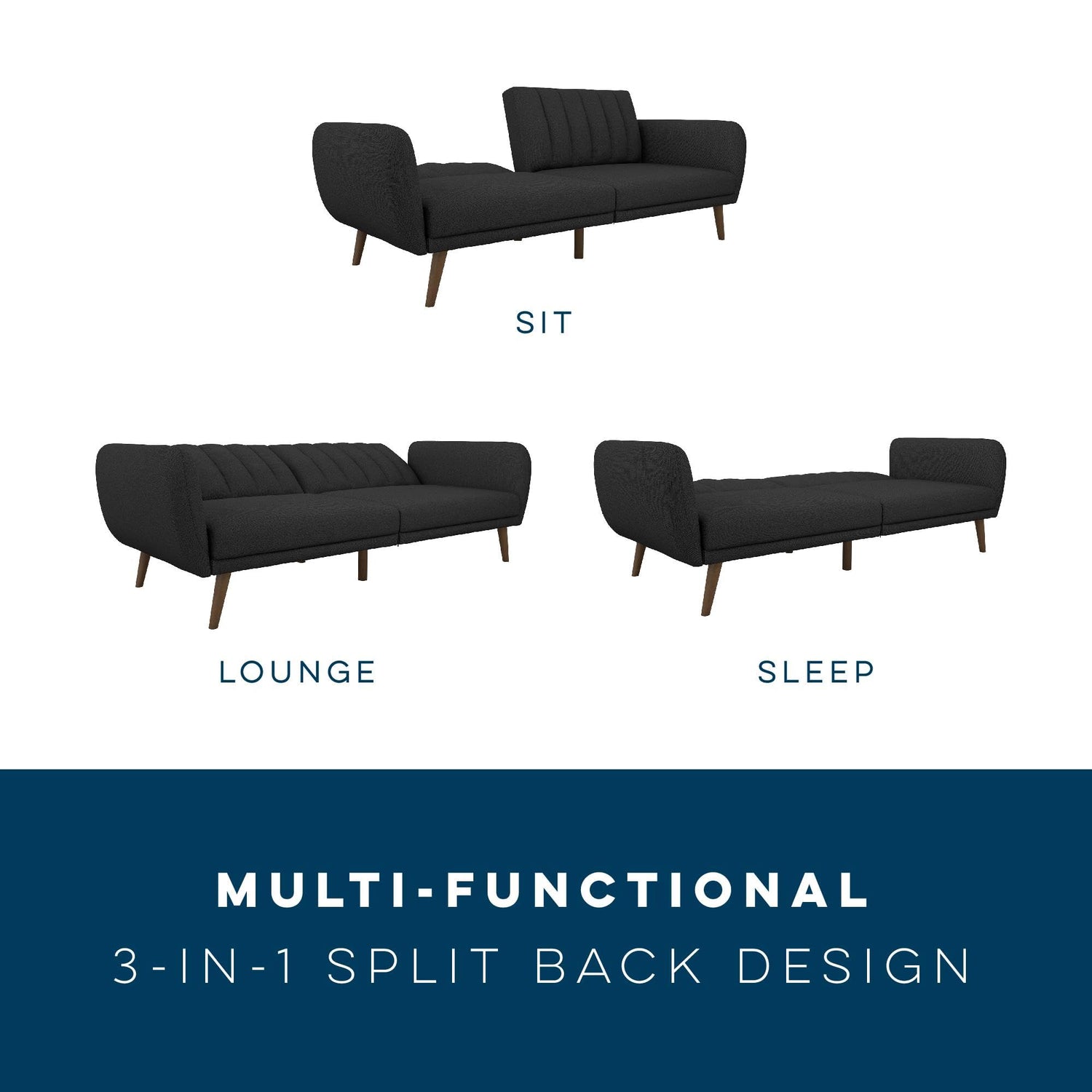 Details: Personal style is expressive and can be transformative - nowhere is that more apparent than inside your home. For Mid-Century Modern décor enthusiasts, the Novogratz Brittany Futon is a game-changing multifunctional furniture piece that will set your living room, home office, or guest room apart from the rest. Part futon couch, part futon bed, it takes a convertible approach to relaxed living with a lowerable folding back that shifts into small sleeper bed form whenever your guests are in need and an easy push-pull split-back mechanism that expands your seating choices for versatile sitting, lounging, and sleeping comfort. Uniquely designed with ribbed channel tufting on the backrest, curved armrests, and 4 slanted solid wood legs that are felt-lined for floor protection, the Brittany's foam cushioned seat and padded arms provide a firm foundation for rest, as do its small-space plywood frame build with supportive no-sag spring backing, 2 plastic center legs, and 2 concealed fold-out support legs located within rear zippered pockets. Offered in multiple colors, the Brittany is available in both easy-to-clean linen look and faux leather upholstery options.