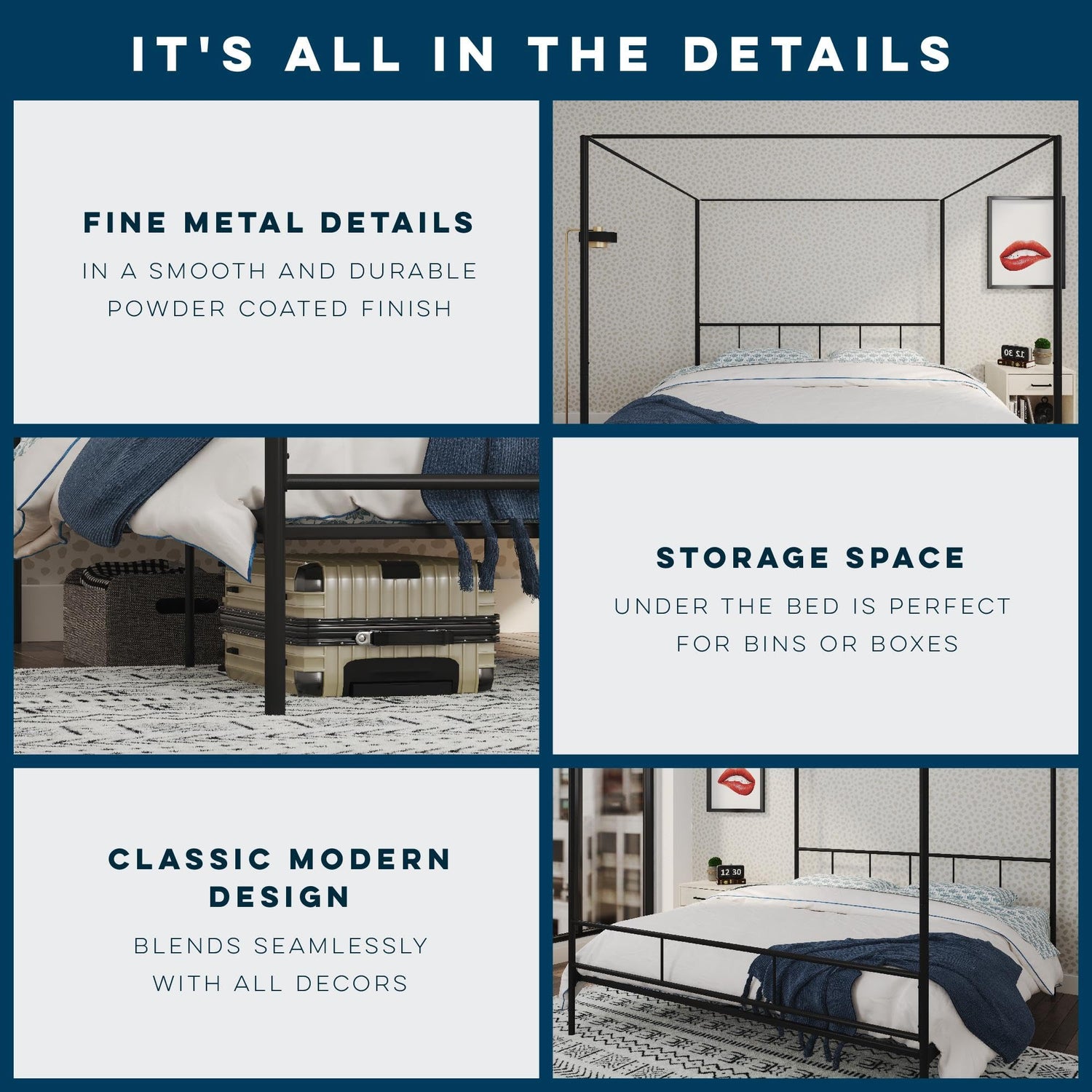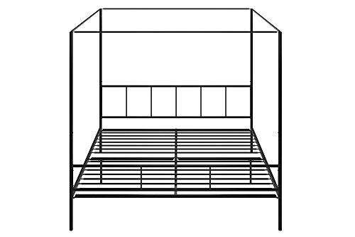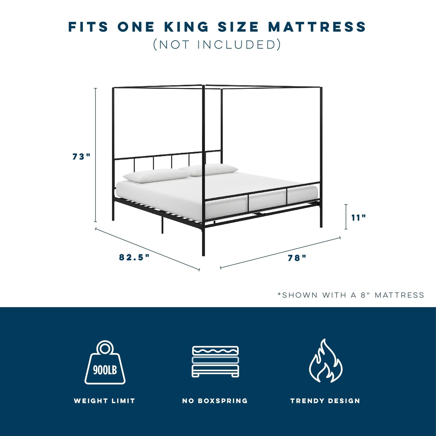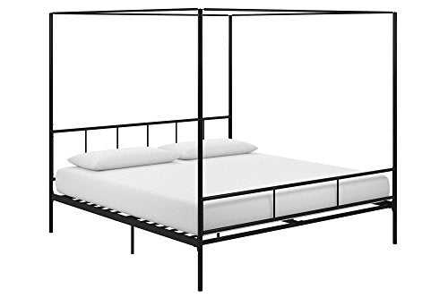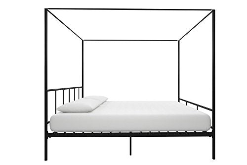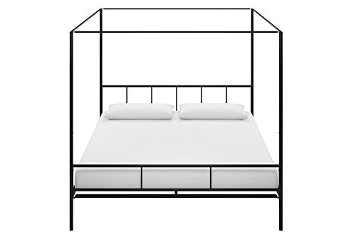Details: The Novogratz Marion Metal Canopy Bed is a stylish and classy addition to any bedroom. Designed with a clean silhouette, this eye-catching modern platform bed frame is crafted in solid and sturdy metal that is stable and durable with secure metal slats with side rails to keep your mattress in place. It comes with a sophisticated headboard and footboard and with metal side rails and center legs to provide full support and comfort to you and your mattress without the need for a box spring. The Marion canopy platform bed is also practical, with 11 inches of clearance underneath, ideal storage bins and organizers. Available in Full, Queen or King size, this four poster bed frame will become the centerpiece of your room!