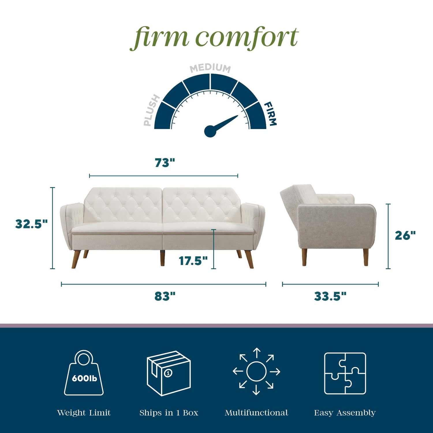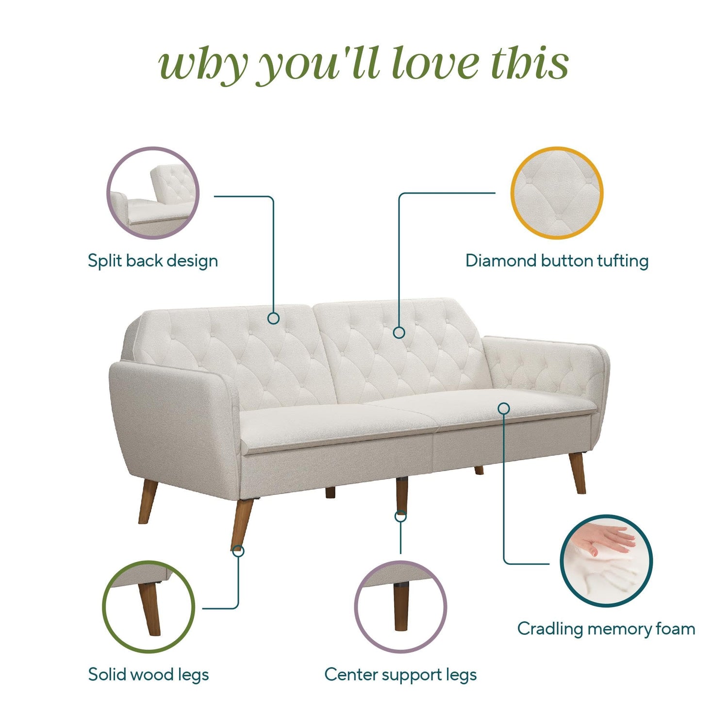 Details: Aside from its bold look, the Novogratz Tallulah Memory Foam Futon Sofa Bed delivers multifaceted appeal on every level. This convertible sofa is perfect for living room, home office, or guest room, embodying mid-century modern sophistication with its vintage shape, rounded edges, and diamond button-tufted back and inner arms. With its feathery-soft and easy-to-clean boucle fabric upholstery, our couch sets itself apart by championing home comfort. Nowhere is this more evident than with its high-density foam and futon mattress memory foam-filled seat cushions, which ease pressure points while cradling the body's curves for medium-firm relief. Featuring an adjustable backrest, padded armrests with piped trim accents, and the ability to transform into a lounger and a bed couch in seconds, the split-back sofa bed provides supreme convenience for sitting, casual lounging, and sleeping. Its construction includes a sturdy plywood frame, sag-free spring backing, solid wood corner and center legs, and fold-out plastic bed support legs for long-lasting support. Multiple fabric and color options are available. Ideal for weekend lounging, holiday hosting, or everyday comfort, this space-saving sleeper ensures versatility with ergonomic adjustment for indoor relaxation. Perfect as a dual-purpose seating solution, this daybed functions beautifully as relaxation furniture for movie nights and holiday hosting. Experience durable resilience with our convertible sofa for unmatched leisure and hosting.