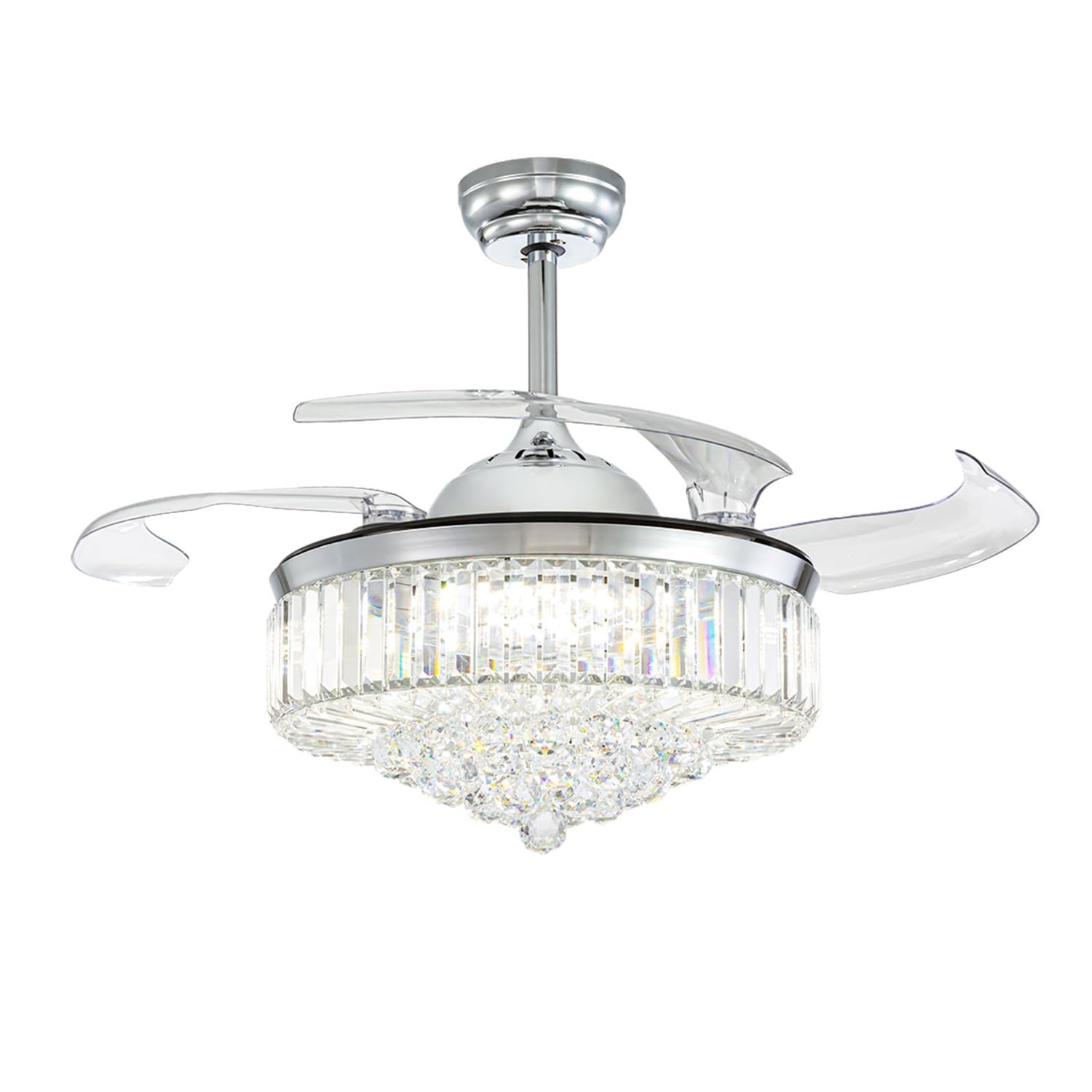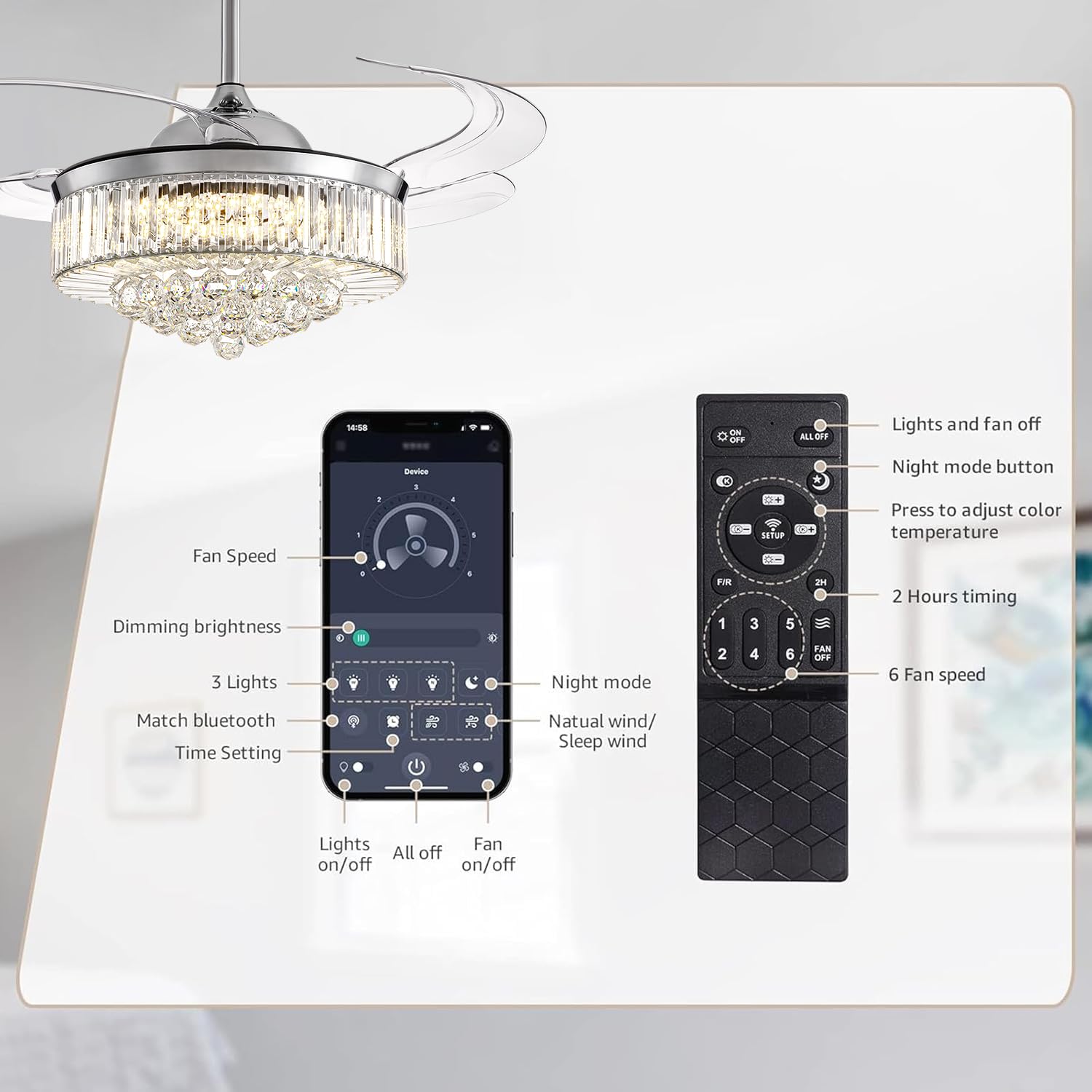 - REMOTE CONTROL: Allows remote control of crystal fandelier ceiling fan with light. Includes forward and reverse rotation, brightness adjustment, night mode, fan blade retraction and opening, 6 speed airflow and timing mechanism.