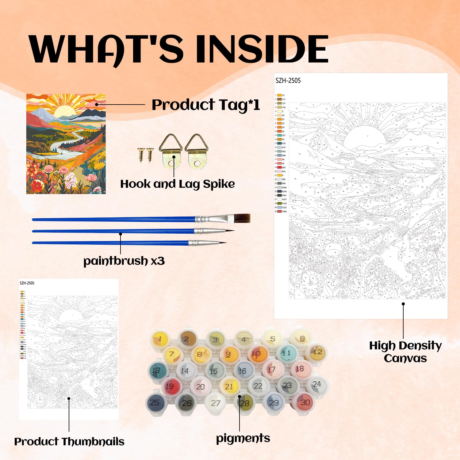 - 【What you will receive】: paint by numbers kit for adults, including 1 unframed canvas (canvas size: 40x50cm/16X20 inches), 1 set of safe acrylic paints, 3 brushes of different sizes, 2 hooks, and 2 nails. Open the package and start painting right away